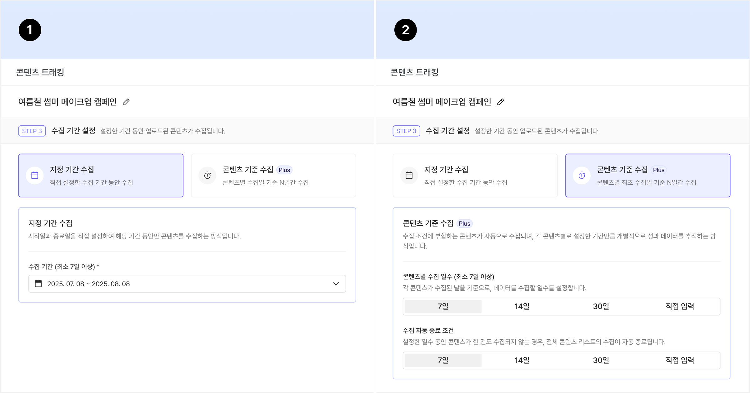 ➋ 콘텐츠 기준 수집 (Plus): 수집 조건에 맞는 콘텐츠가 발견되는 대로 자동으로 수집되며, 수집된 각 콘텐츠마다 설정한 기간만큼 성과 데이터를 개별적으로 수집하는 방식입니다.
