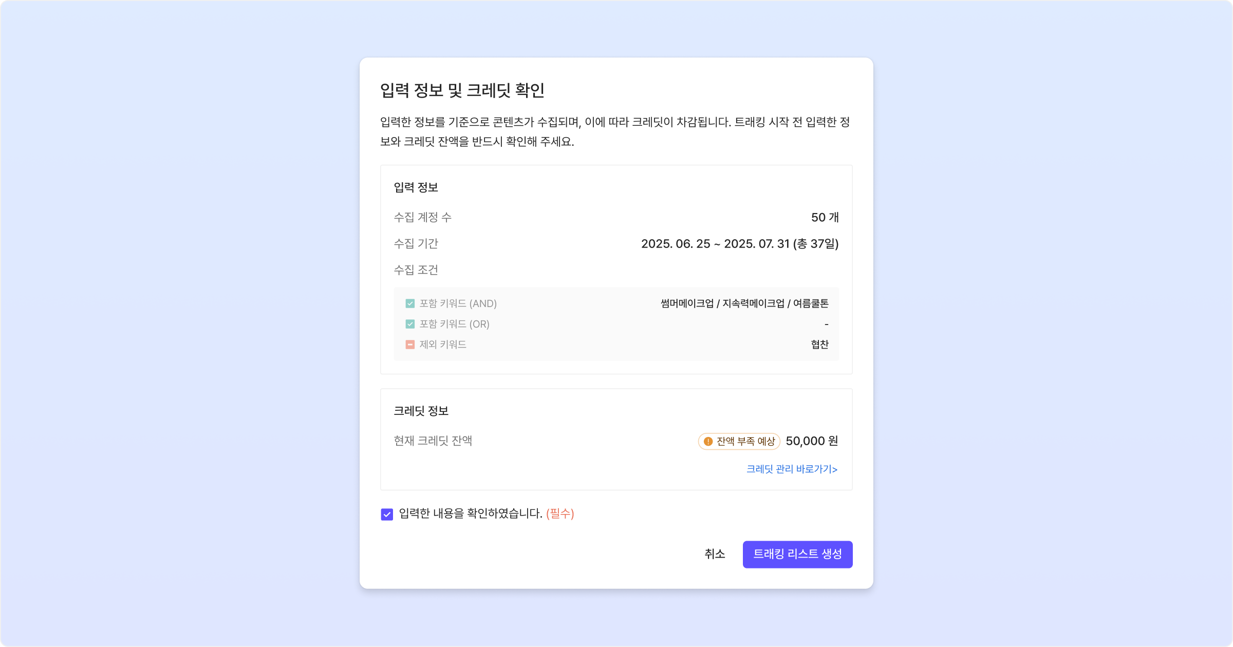 입력한 정보를 기준으로 콘텐츠 수집 및 트래킹이 시작되며, 수집된 콘텐츠와 트래킹 기간에 따라 매일 크레딧이 차감됩니다.