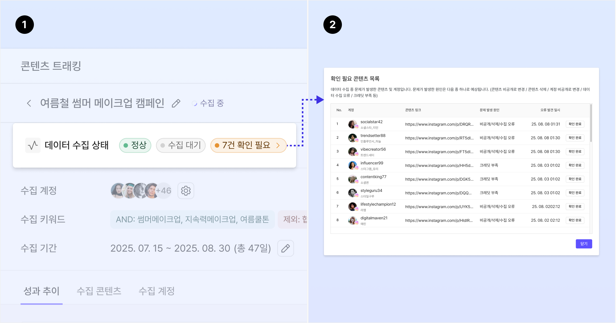 데이터 수집 상태가 '확인 필요' 상태인 경우 해당 상태 뱃지를 클릭하여 확인이 필요한 콘텐츠 목록을 확인할 수 있습니다. 확인을 마친 콘텐츠는 우측의 '확인 완료' 버튼을 눌러 해당 목록에서 제거할 수 있습니다.