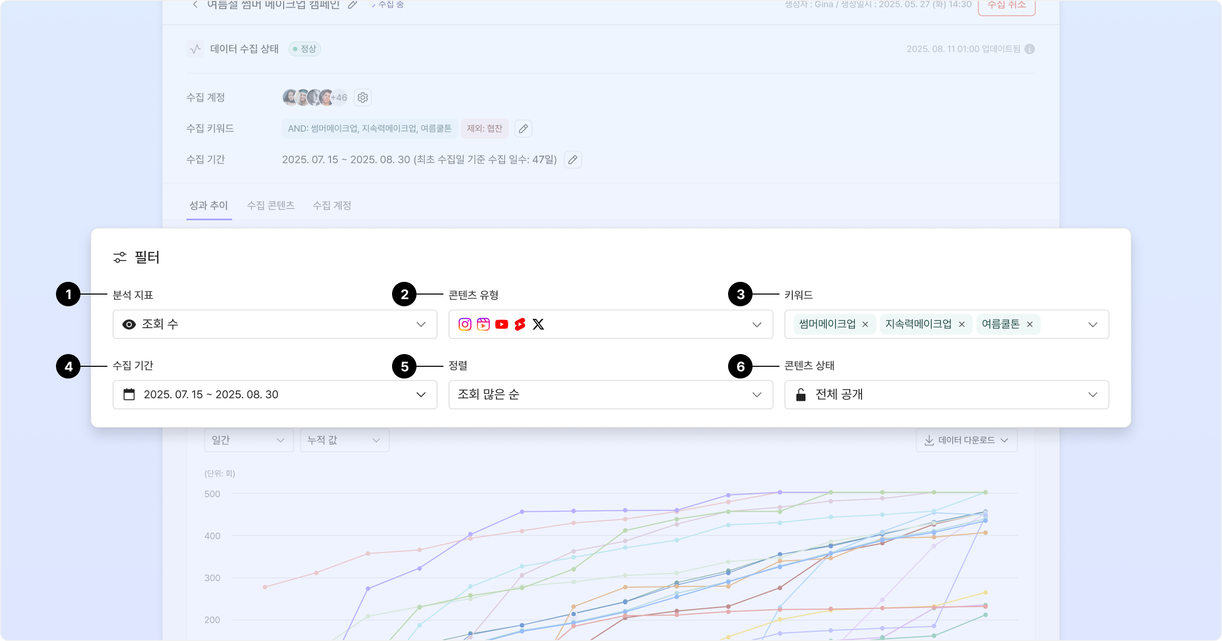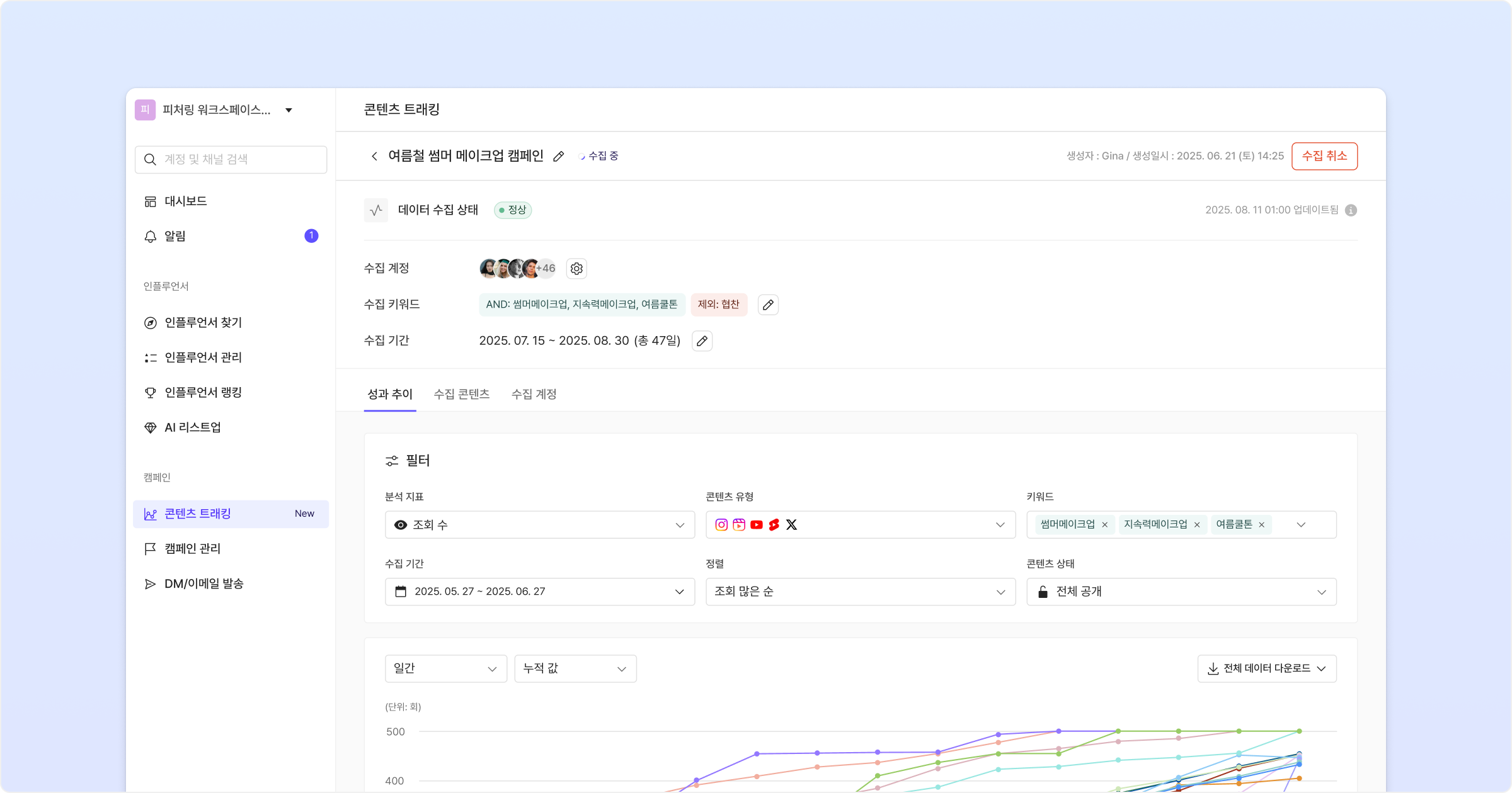 특정 기간 동안 등록한 인플루언서가 올린 키워드 기반 콘텐츠 성과를 분석할 때