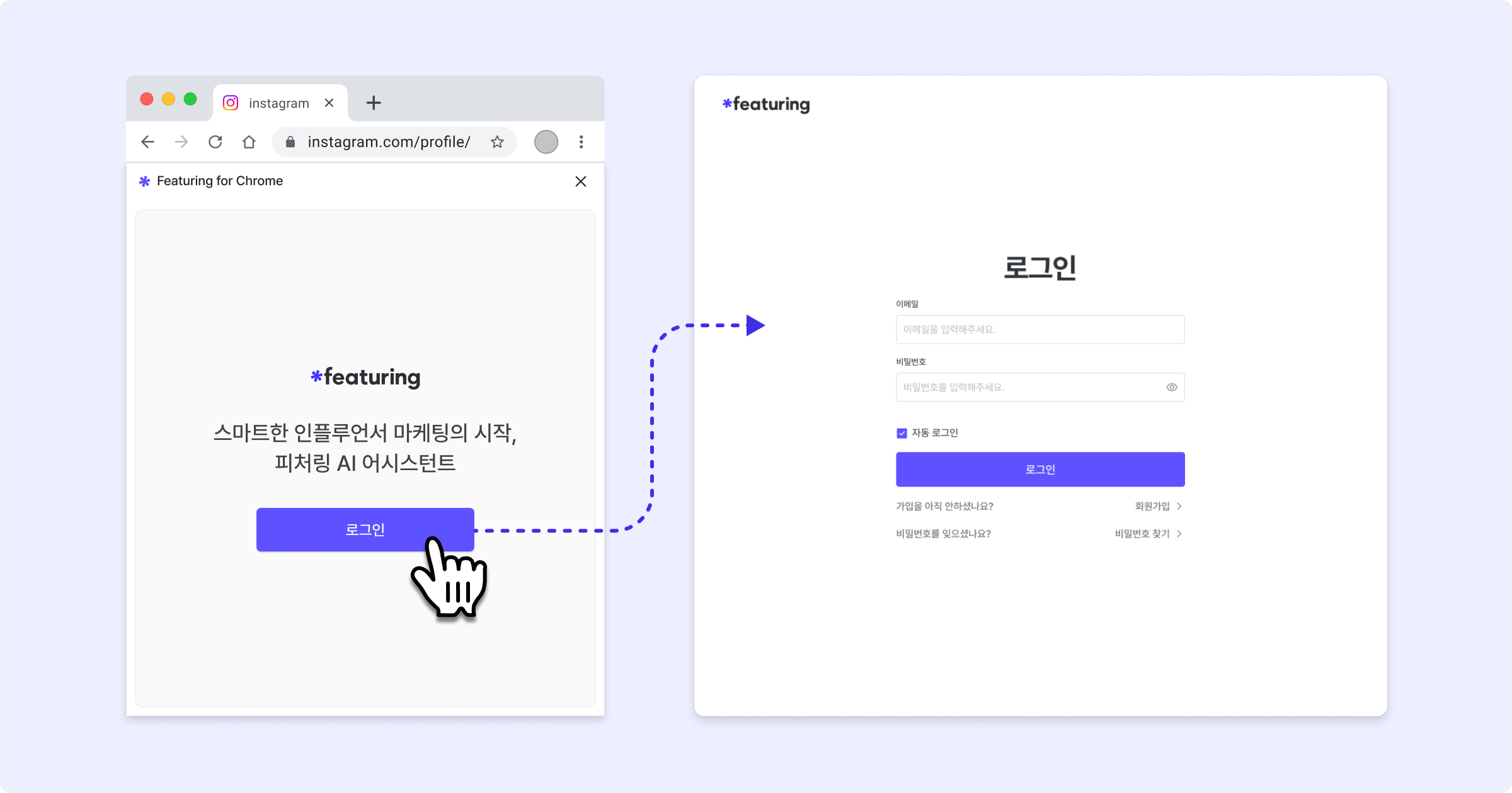 로그인 버튼을 클릭해 피처링 로그인 페이지에서 피처링에 등록된 계정으로 로그인합니다.