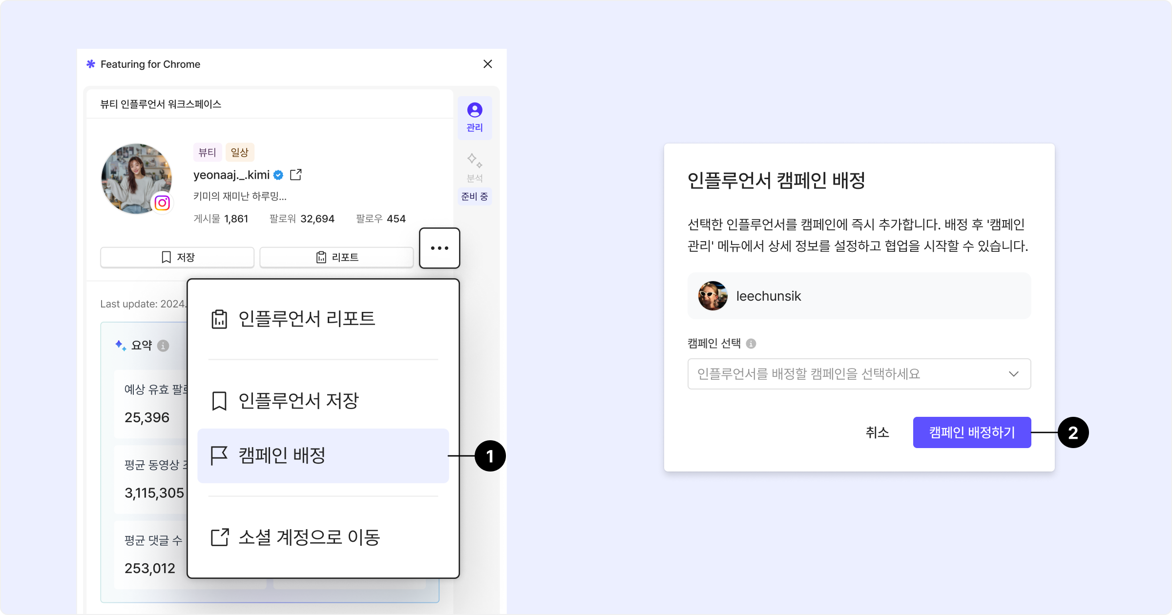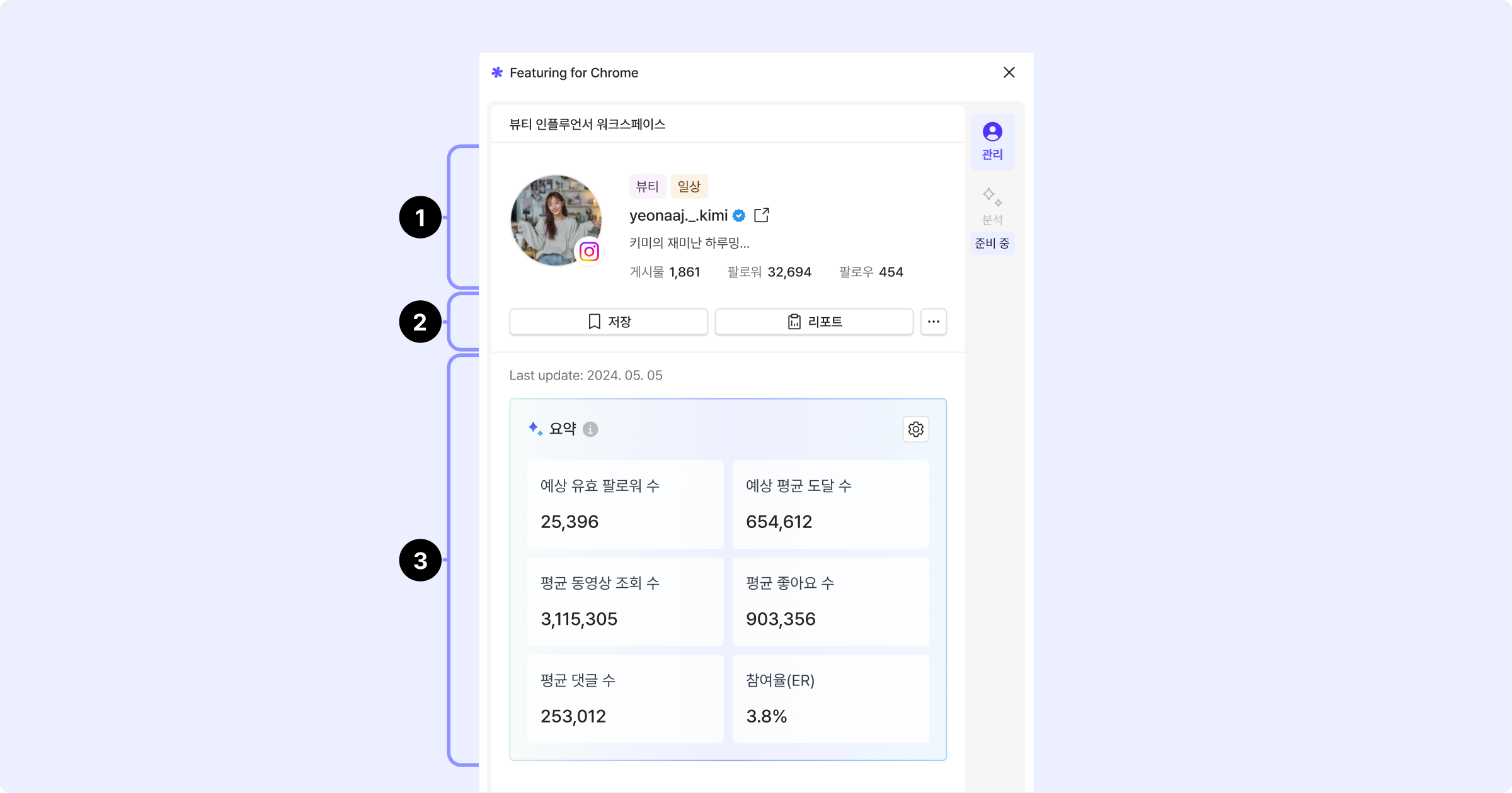 ❸ 분석 버튼 클릭 시 사이드 패널에 인플루언서 분석 결과 표시.