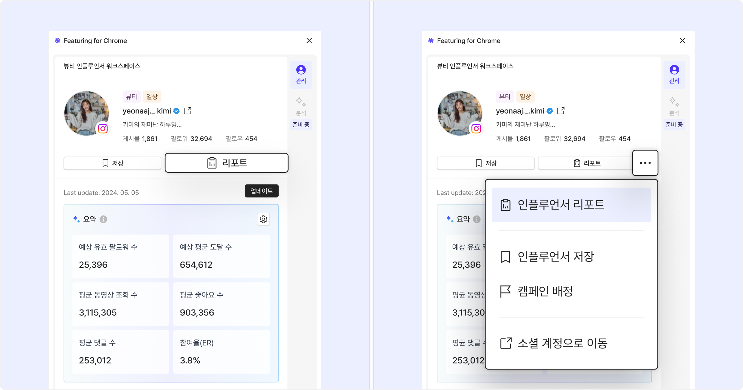 '더보기' 버튼 클릭 > '인플루언서 리포트' 버튼 클릭.