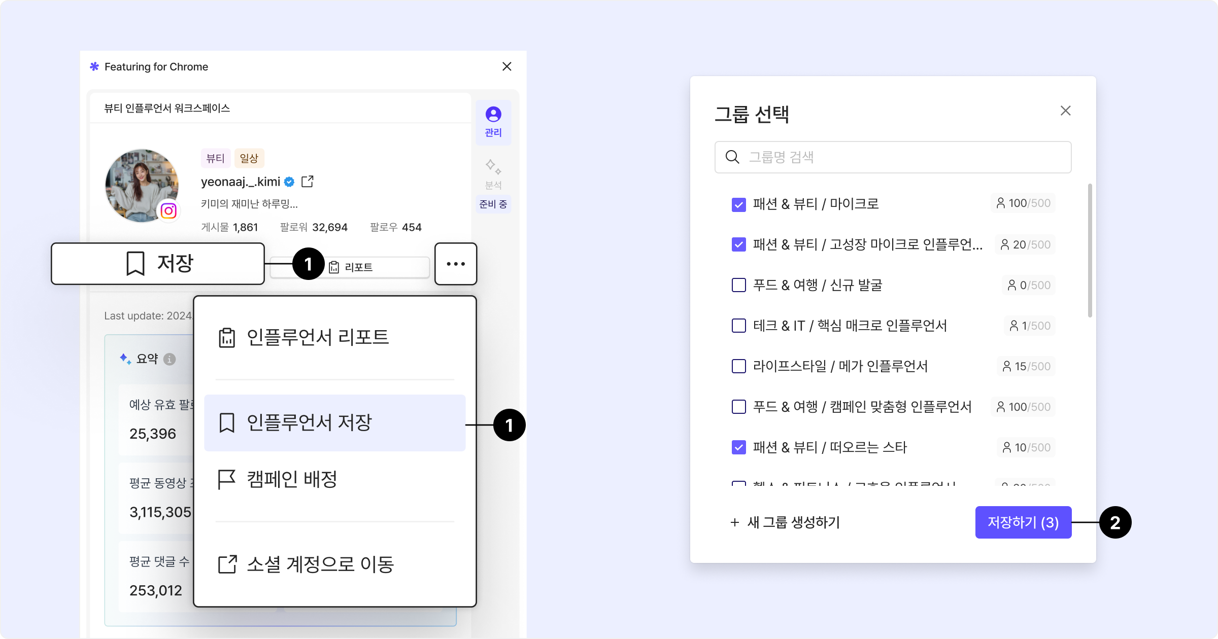 '더보기' 버튼 클릭 > '인플루언서 저장' 버튼 클릭.