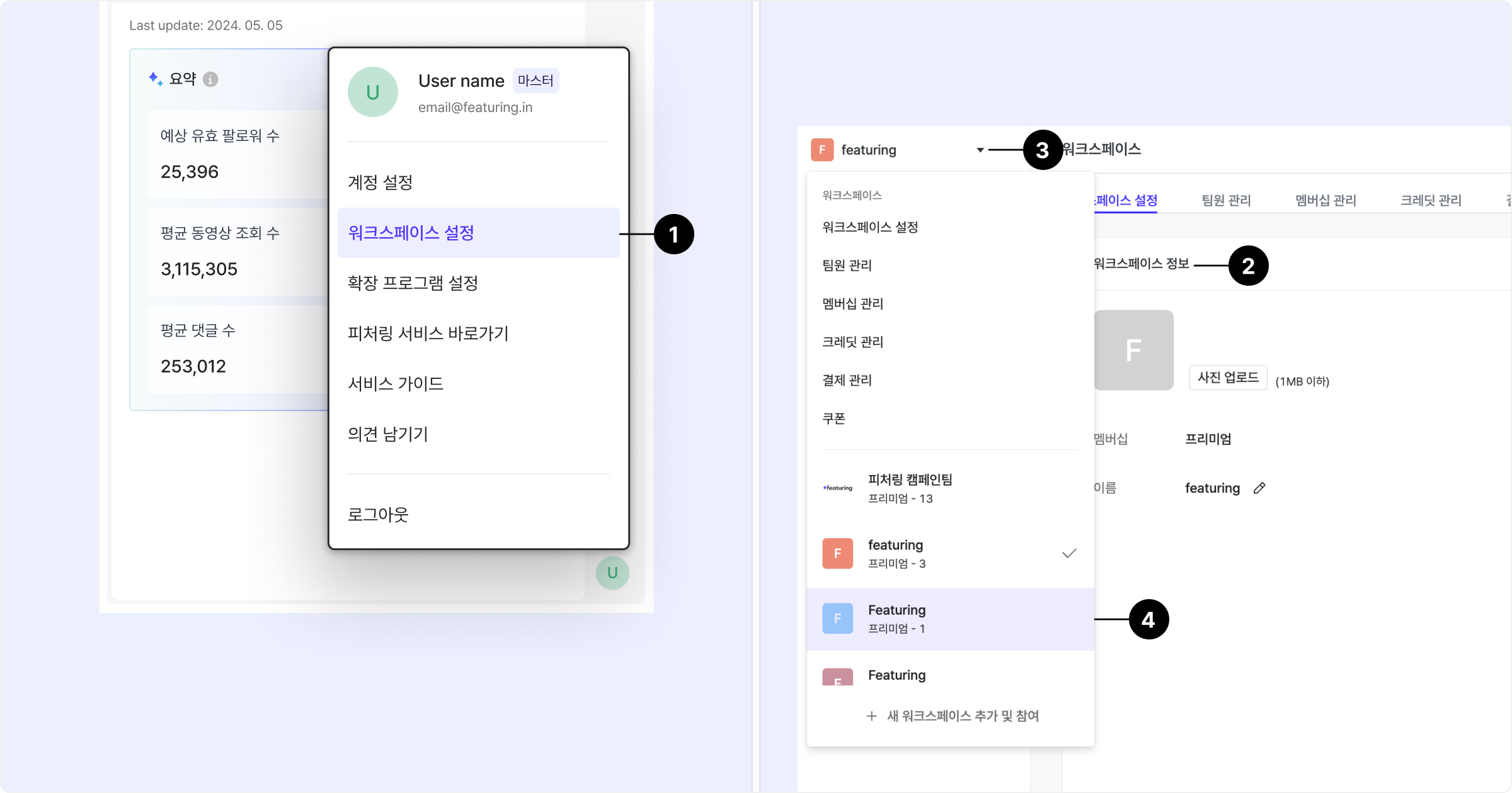 원하는 워크스페이스를 선택해 인플루언서를 관리할 수 있습니다.