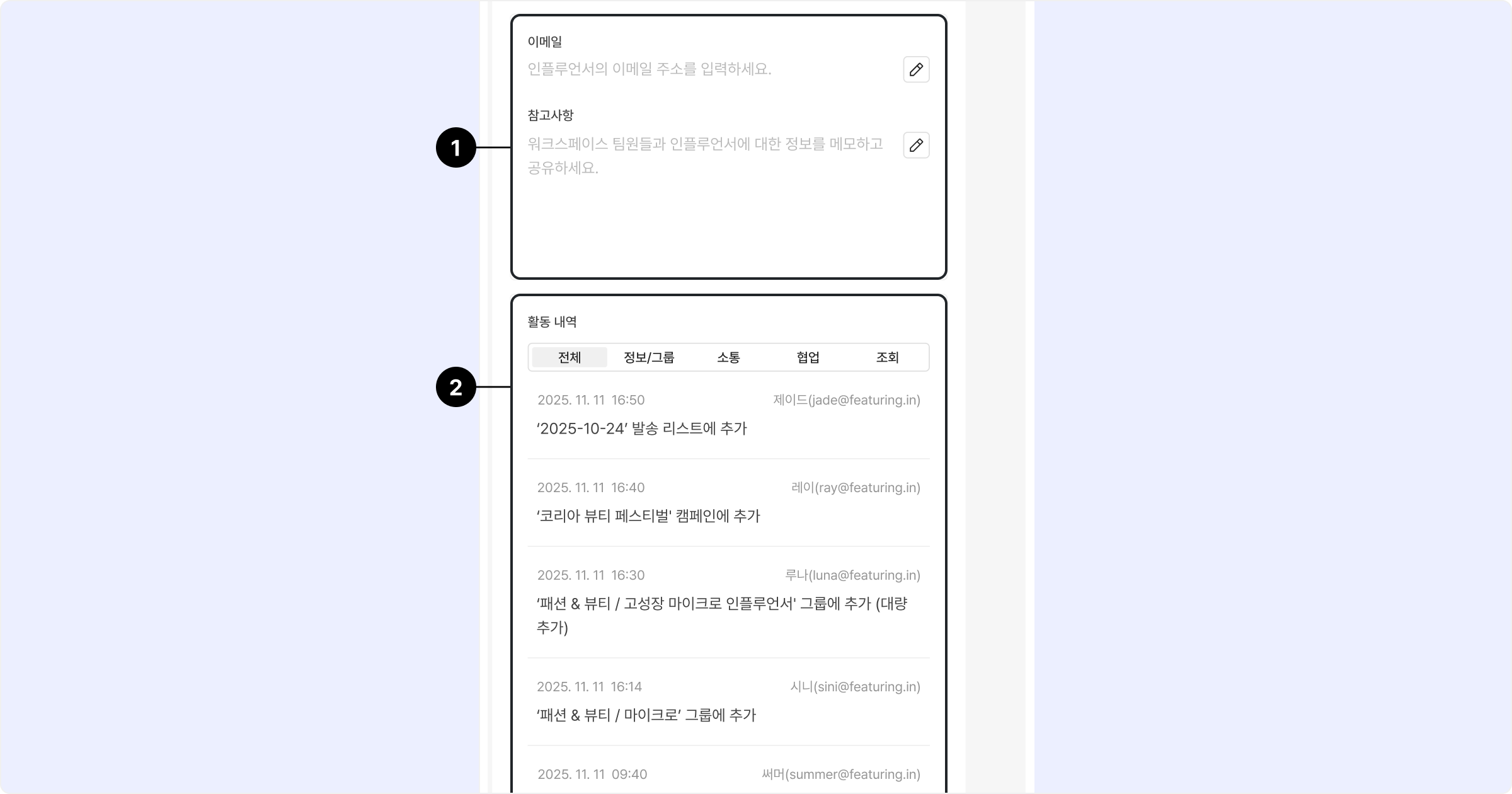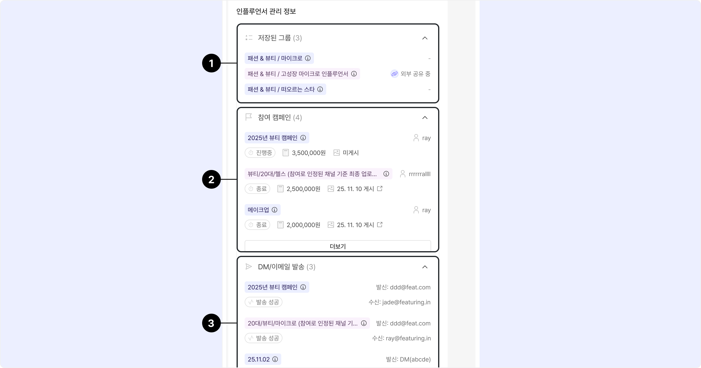 피처링 크롬 익스텐션을 통해 식별된 인플루언서의 캠페인 참여 이력, 저장 그룹 현황, DM/이메일 발송 내역 등 워크스페이스 단위의 관리 정보를 바로 확인할 수 있습니다.