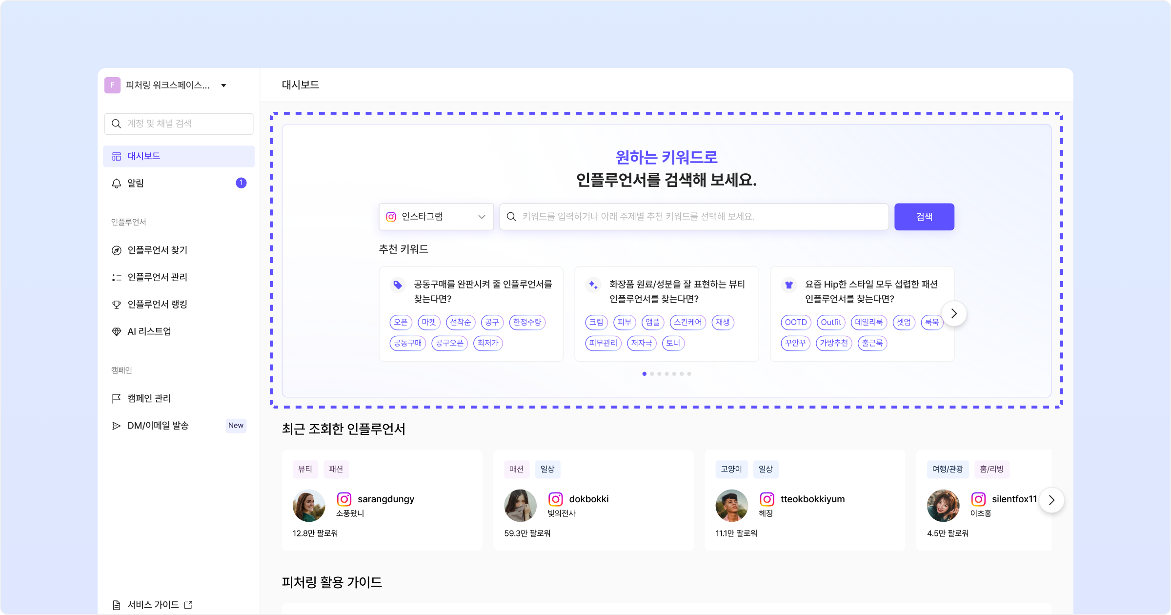 대시보드 상단에서 원하는 키워드로 인플루언서를 직접 검색할 수 있는 기능입니다.