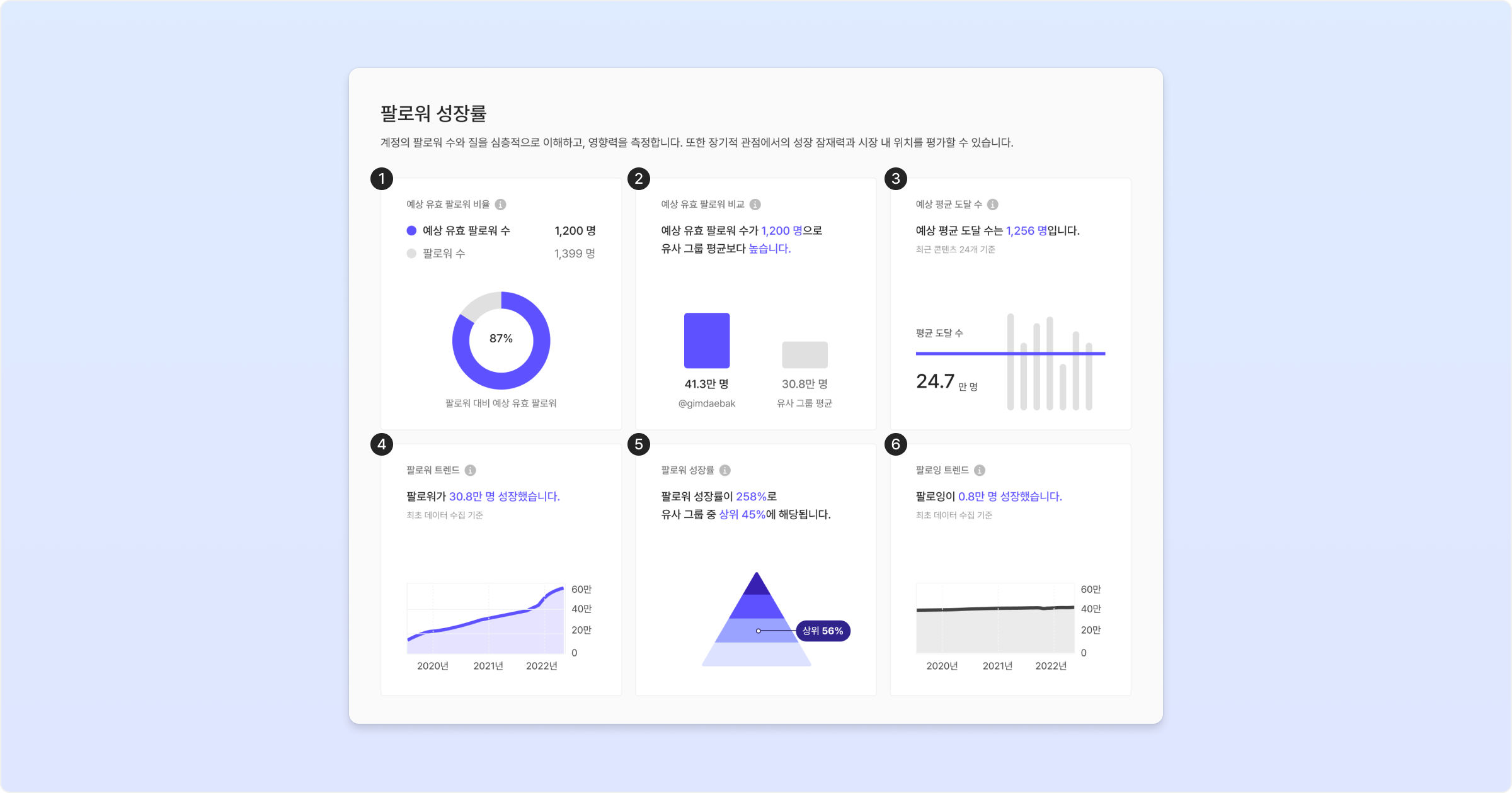 계정의 팔로워 수와 질을 심층적으로 이해하고, 영향력을 측정합니다. 또한 장기적 관점에서의 성장 잠재력과 시장 내 위치를 평가할 수 있습니다.