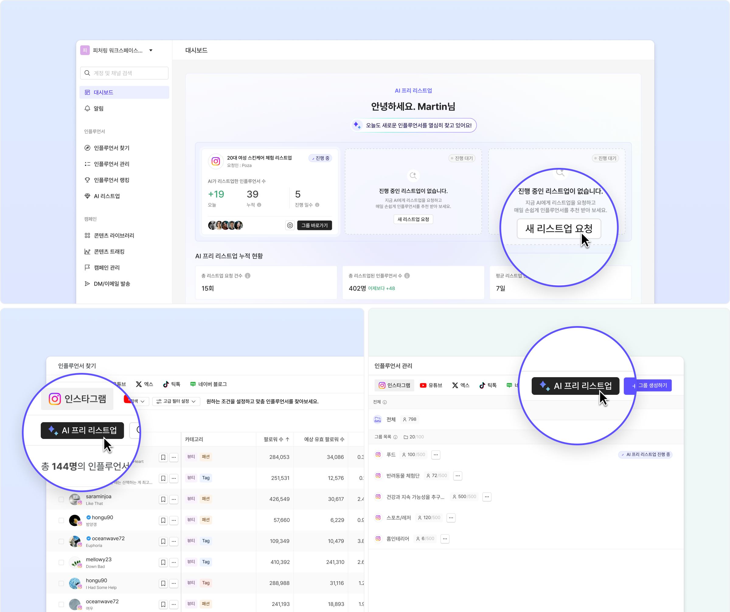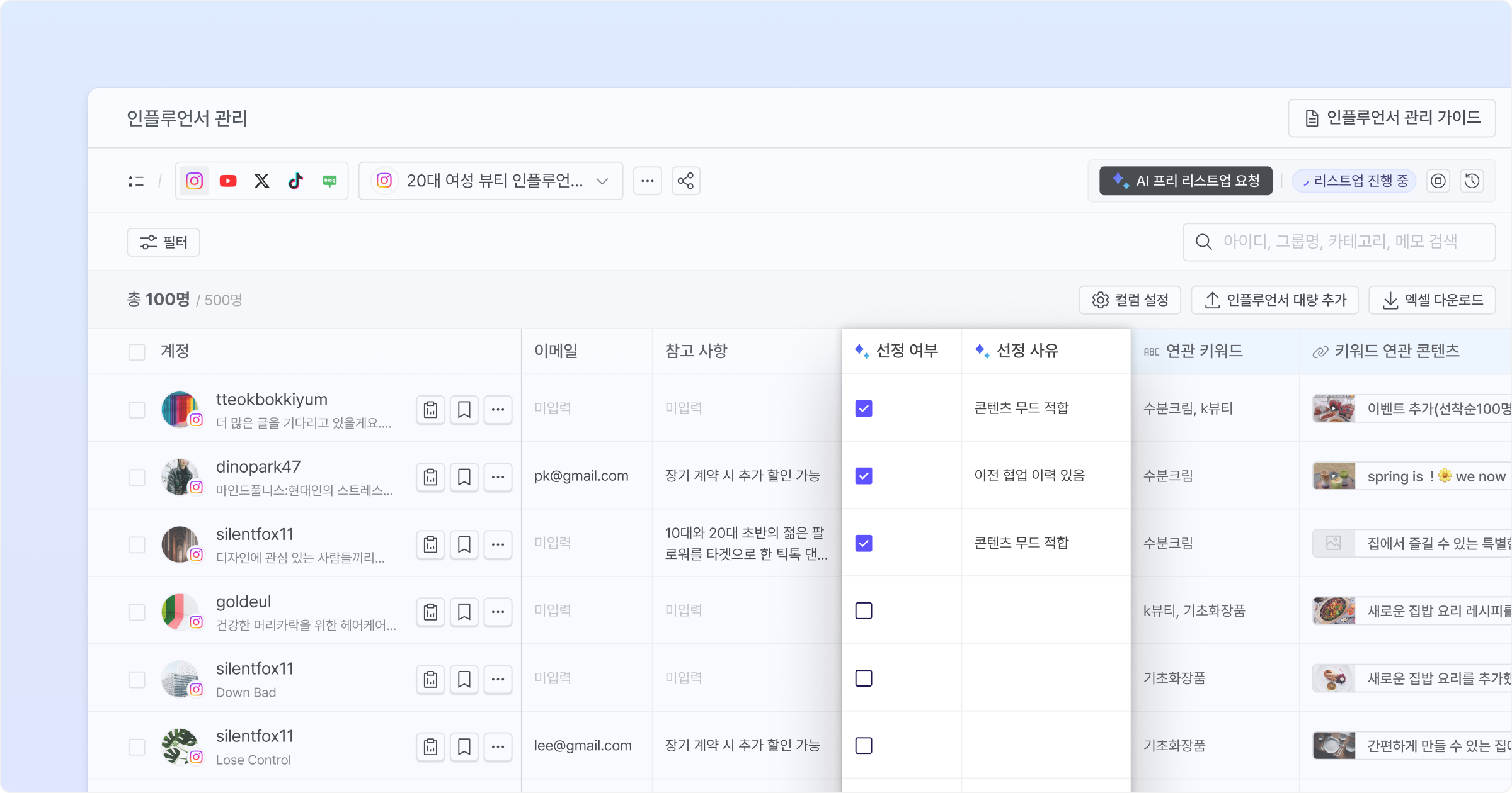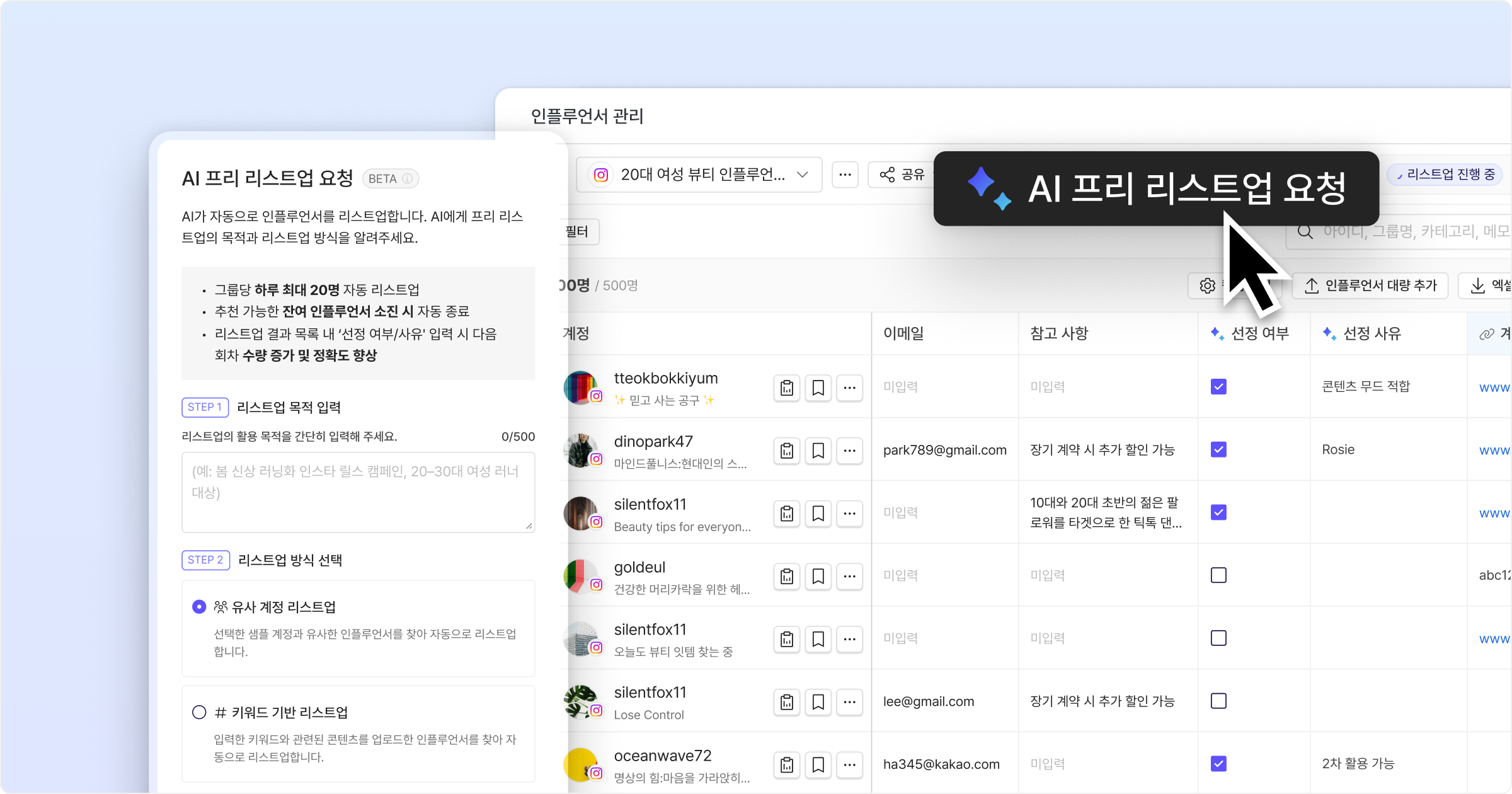 *AI 프리 리스트업은 현재 Beta 기능으로, 대시보드, 인플루언서 찾기, 인플루언서 관리 페이지에서 요청하실 수 있습니다.