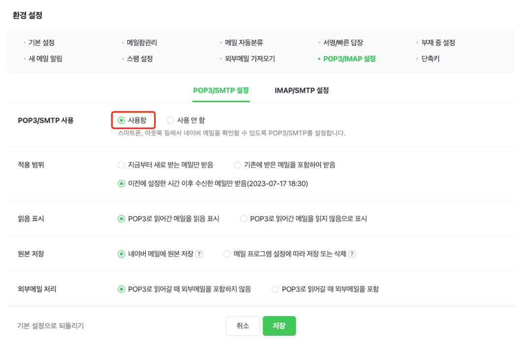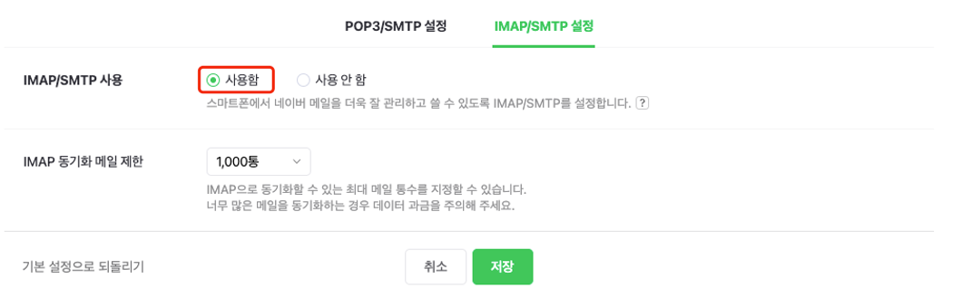 ❹ POP3/SMTP 설정 → IMAP/SMTP 설정으로 변경 후 아래 이미지와 같이 설정
