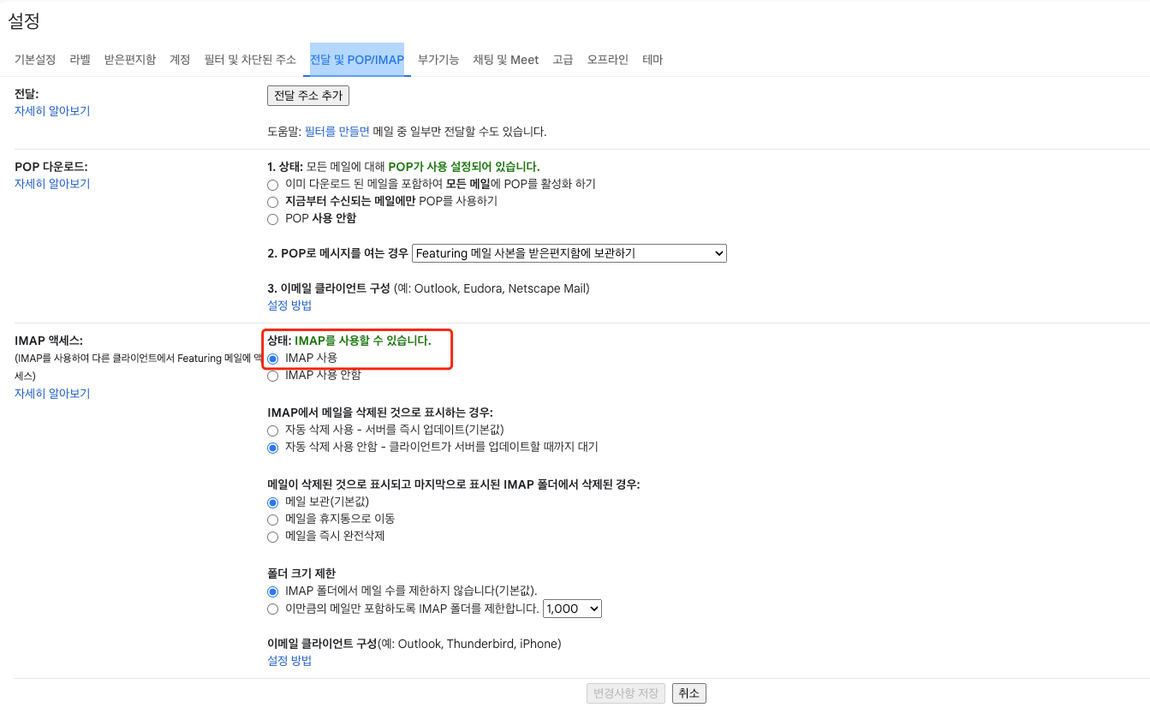 ❸ 전달 및 POP/IMAP 클릭 후 다음과 같이 설정 후 저장