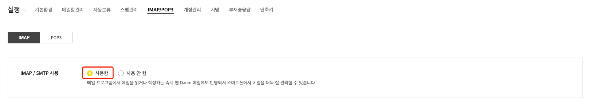 1. 해당 이메일 플랫폼에서 SMTP/IMAP 허용 설정