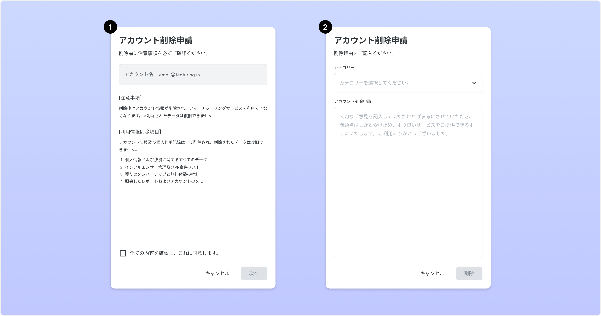アカウント削除申請時には ❶案内内容への同意と❷削除理由を入力することで、退会が完了します。