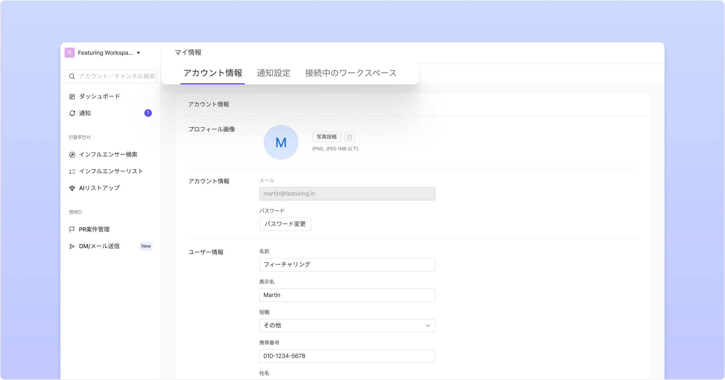 [アカウント設定]タブで、プロフィール画像、パスワード、名前、ニックネーム、電話番号、会社名を編集できます。