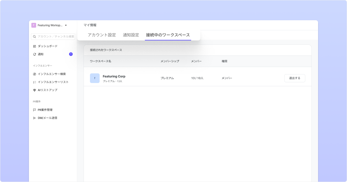 マイ情報ページでは、アカウントに紐付いたワークスペースを管理できます。