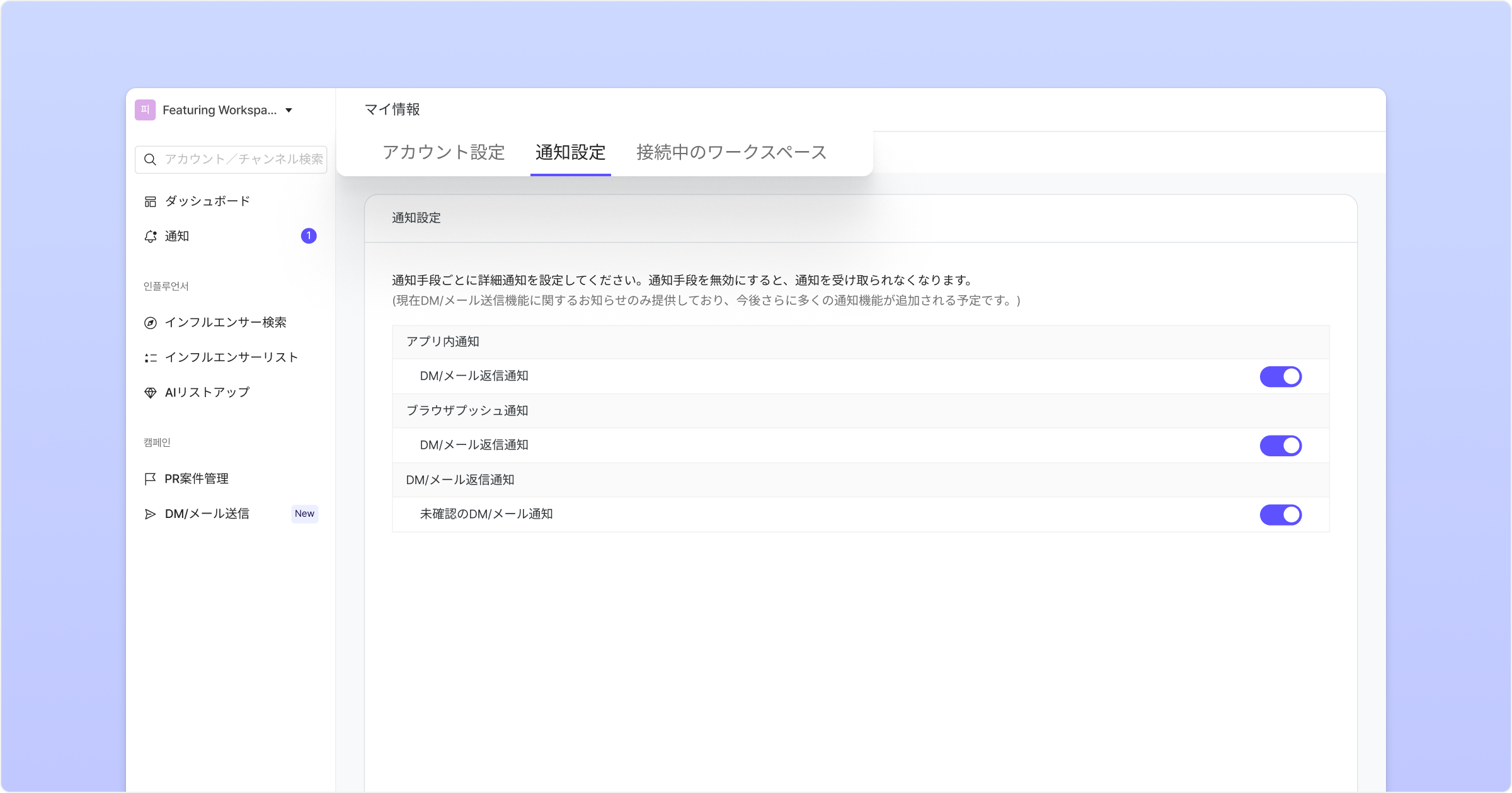 現在はDMおよびメール送信機能に関する通知のみ提供していますが、今後さらに多様な機能に対応した通知設定が追加される予定です。