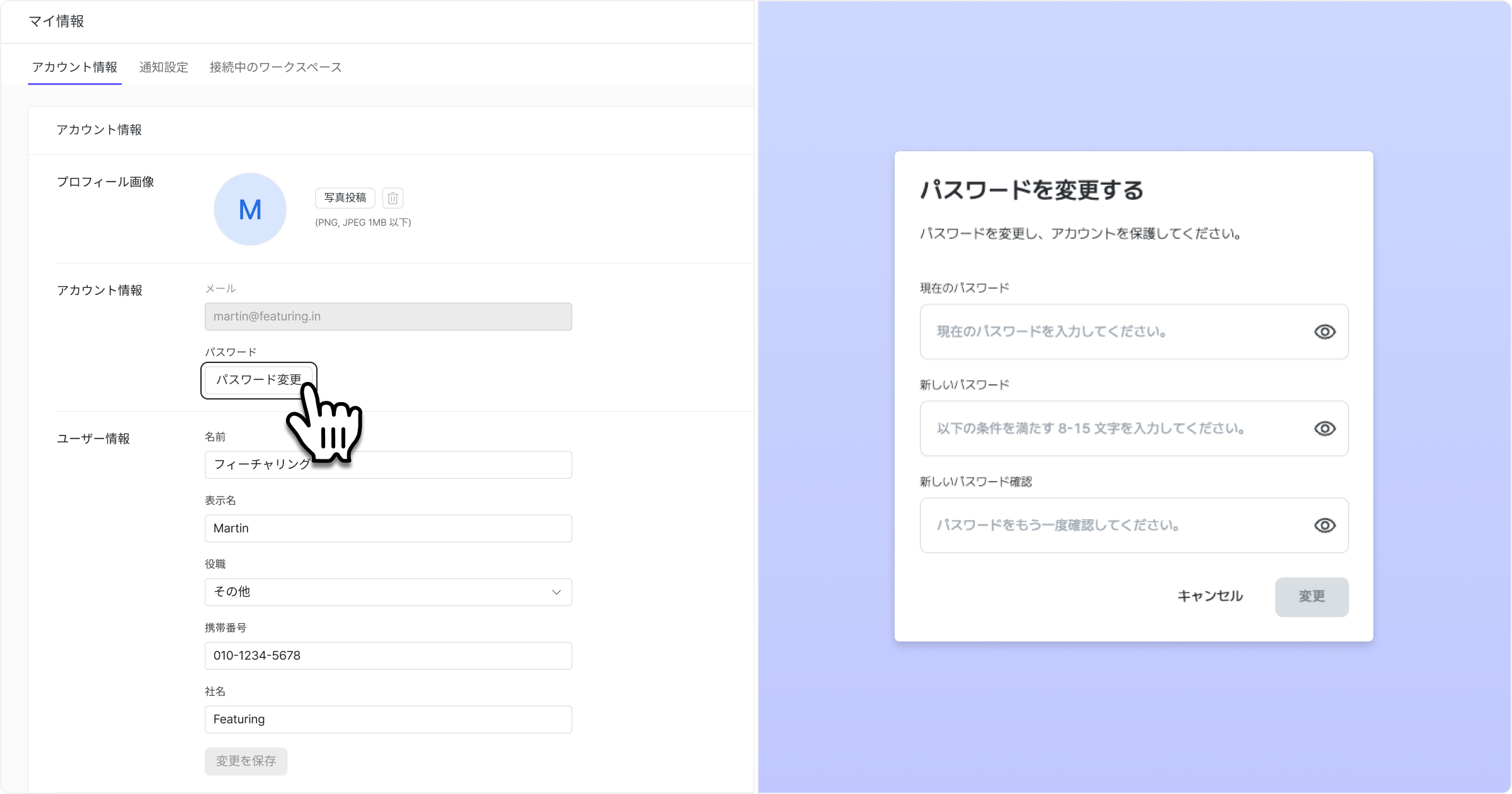 パスワード変更ボタンをクリックすると、パスワード変更のモーダルが表示されます。現在のパスワードと新しいパスワードを入力して、パスワードを変更できます。