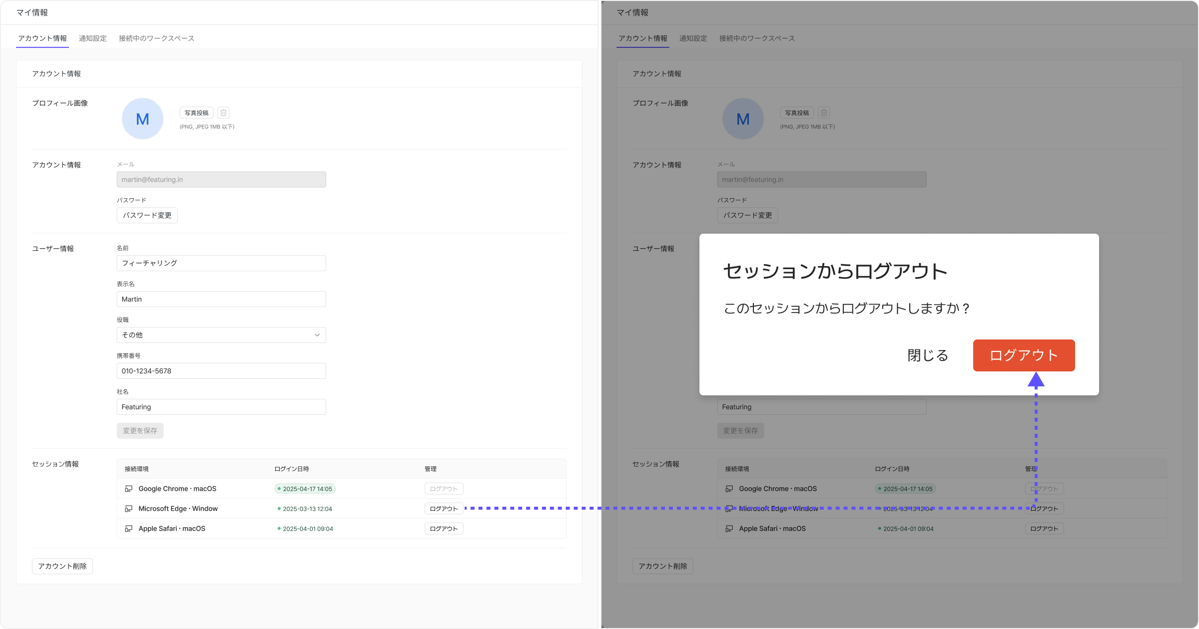 ❷ アカウント設定 - セッション情報アカウント設定ページでは、現在ログイン中のセッションを確認および管理することができます。新しい環境でログインするには、このページで既存のセッションのいずれかをログアウトしてください。