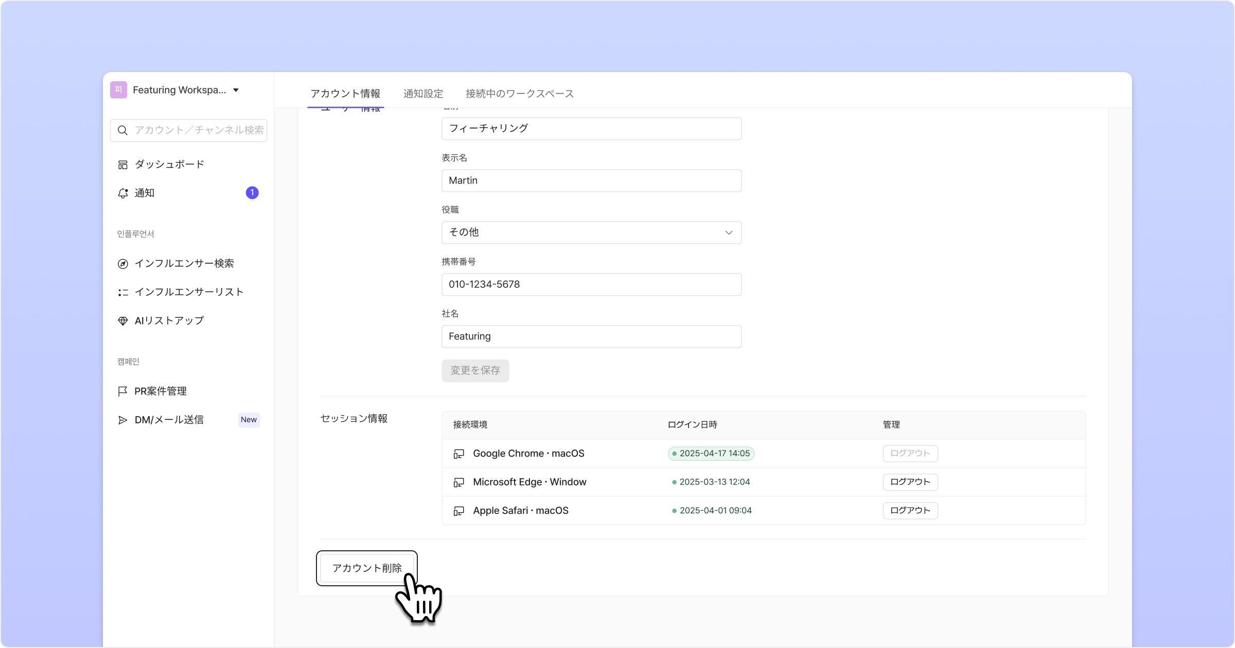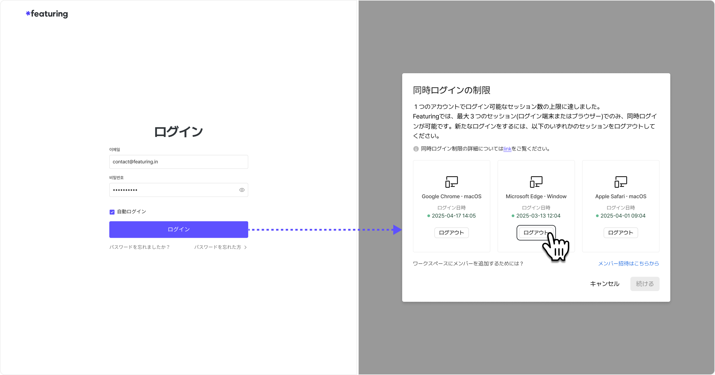 Featuringでは、1アカウントにつき最大3つのセッション(ログイン済みのブラウザまたはデバイス)で同時ログインが可能です。セッション数を超えた状態で新しい環境からログインしようとした場合は、以下の案内に従って既存のセッションを終了または管理してください。
