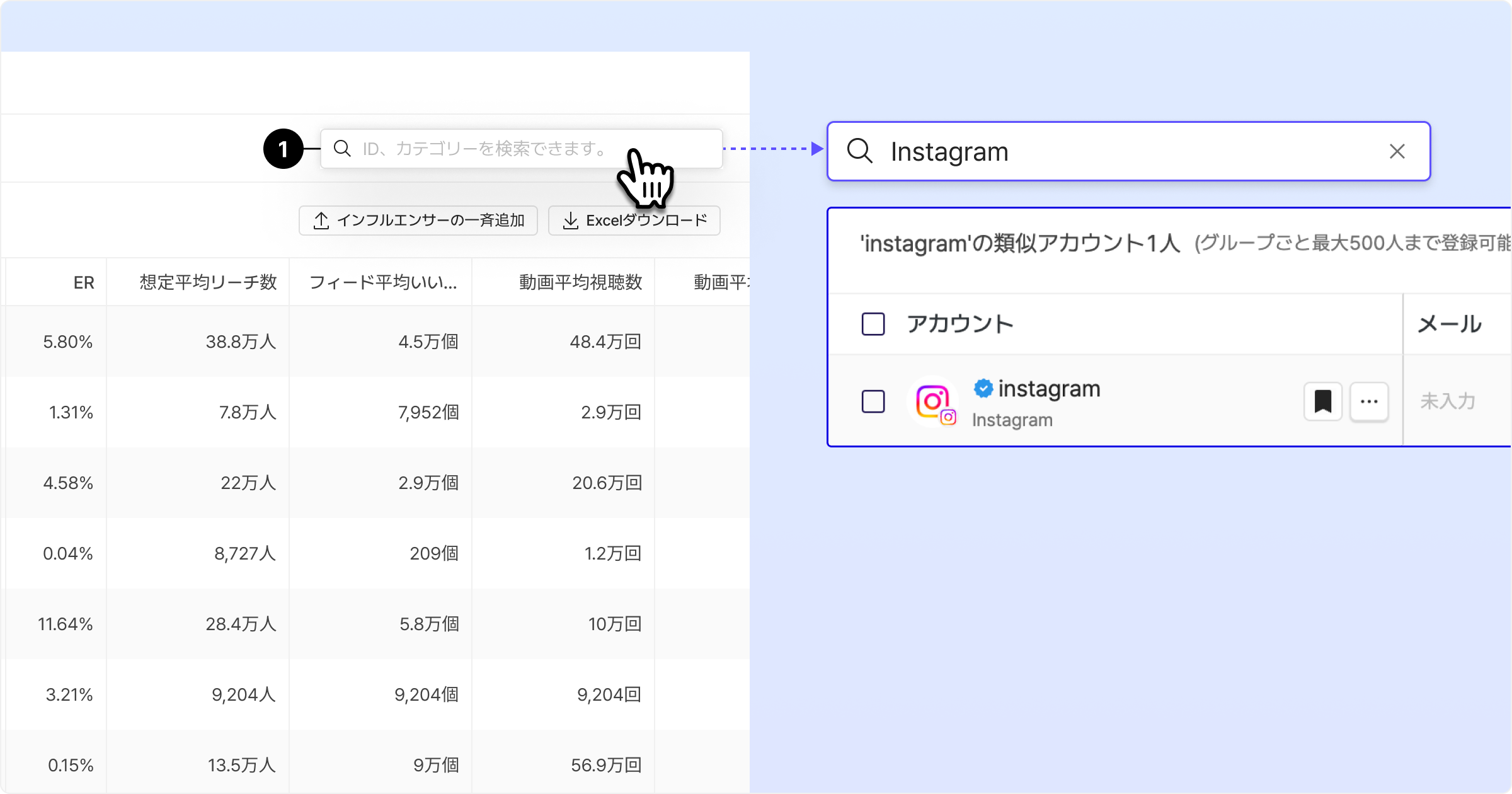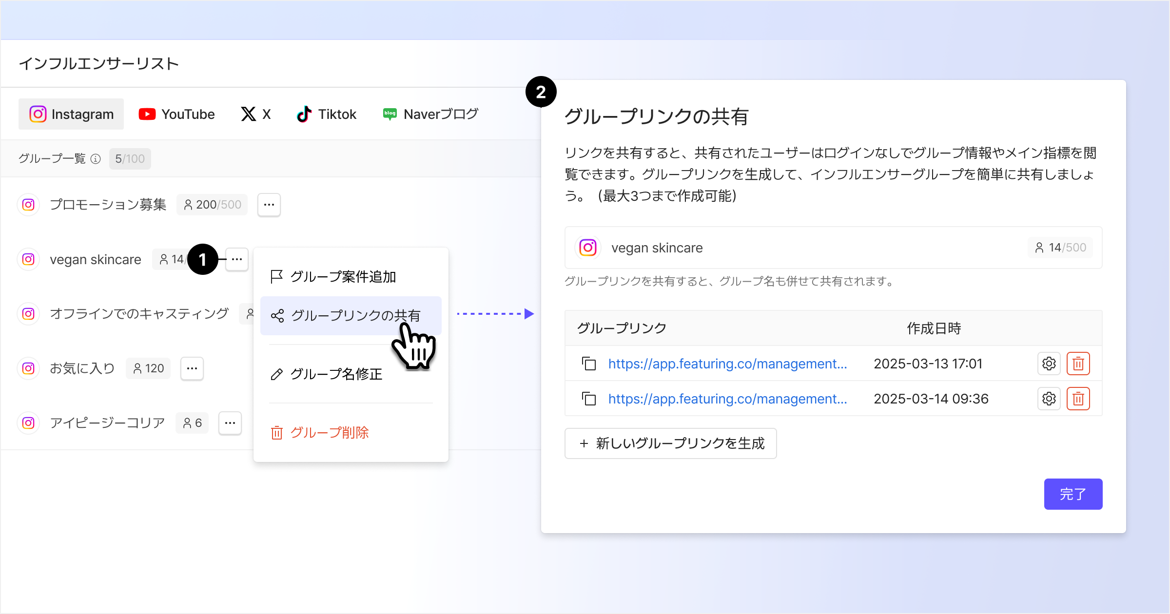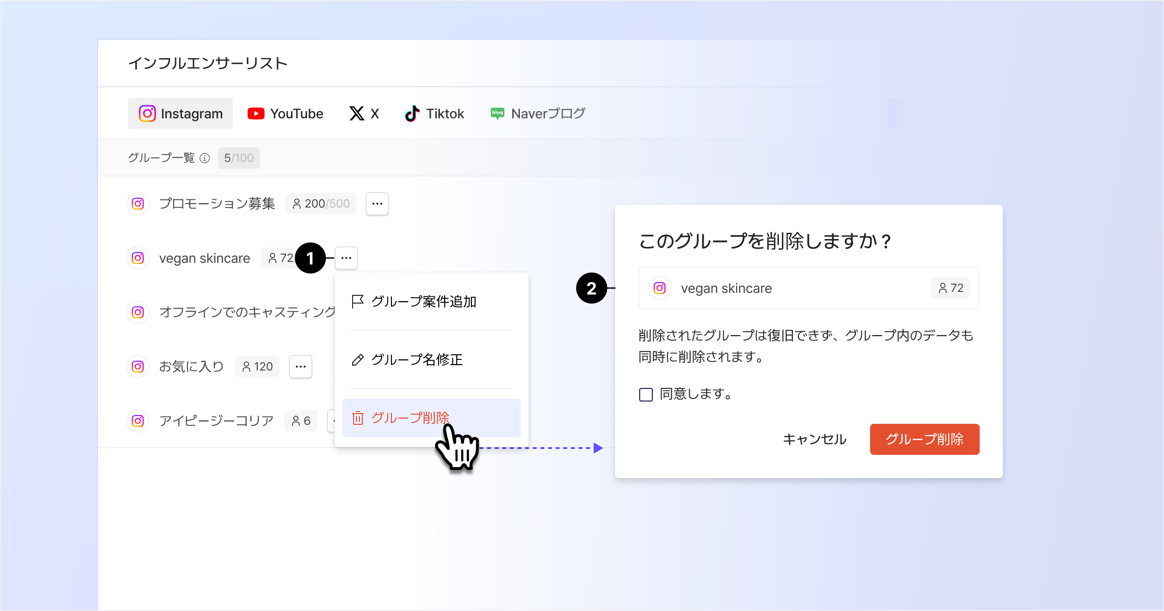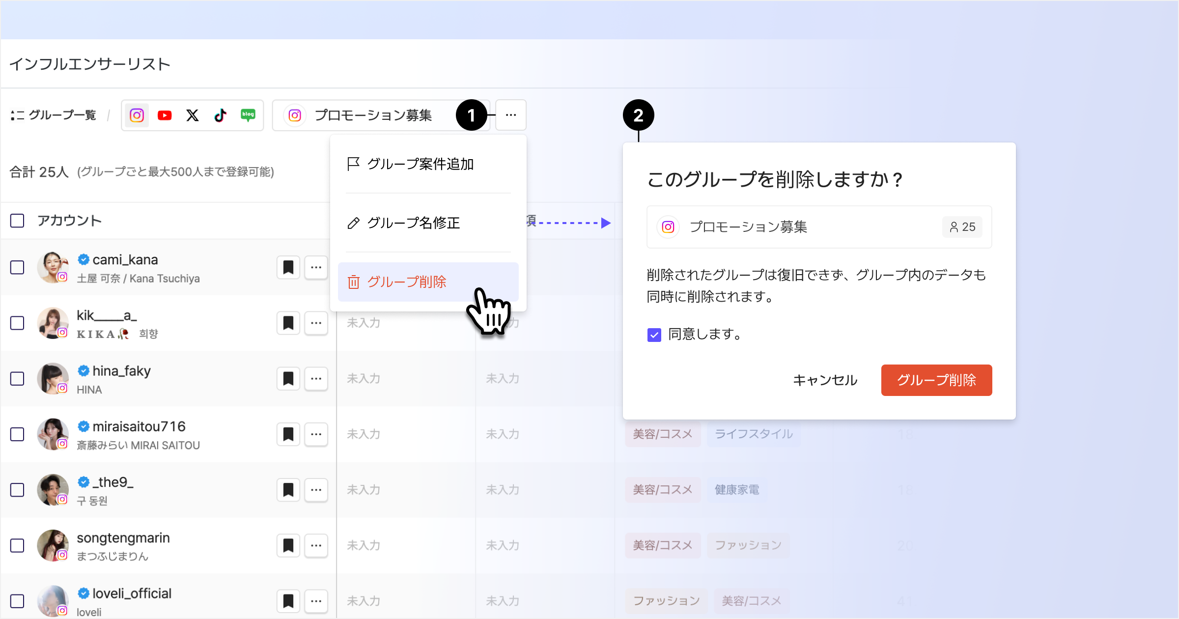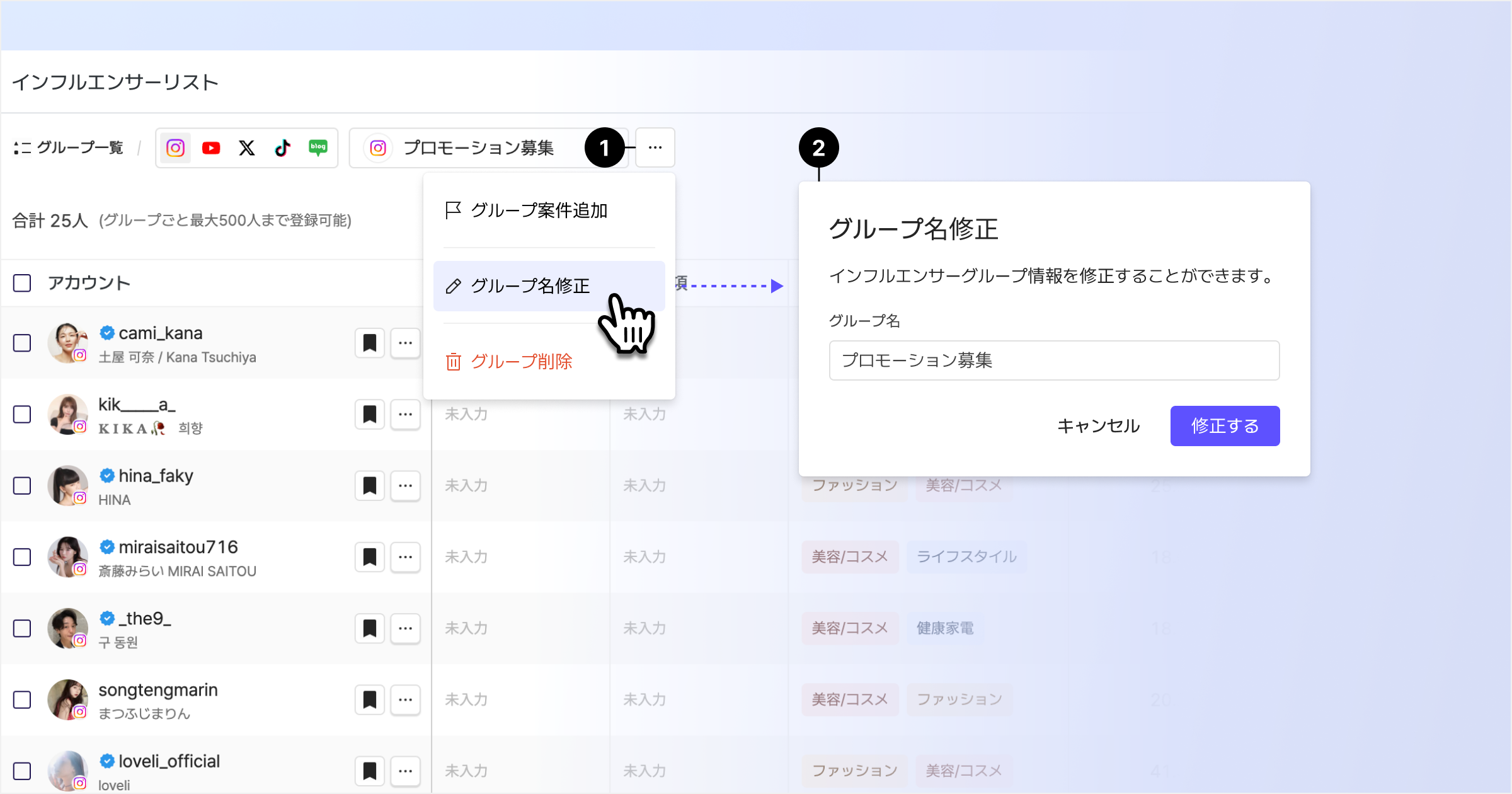 グループ内のインフルエンサーを簡単に検索できる機能を提供します。❶ タブ右側の検索バーに ❷ 検索したいインフルエンサーの名前を入力すると、下部のリストに検索結果が表示されます。