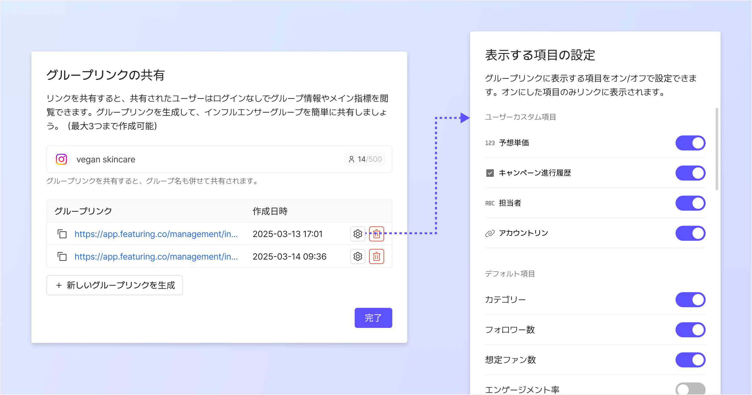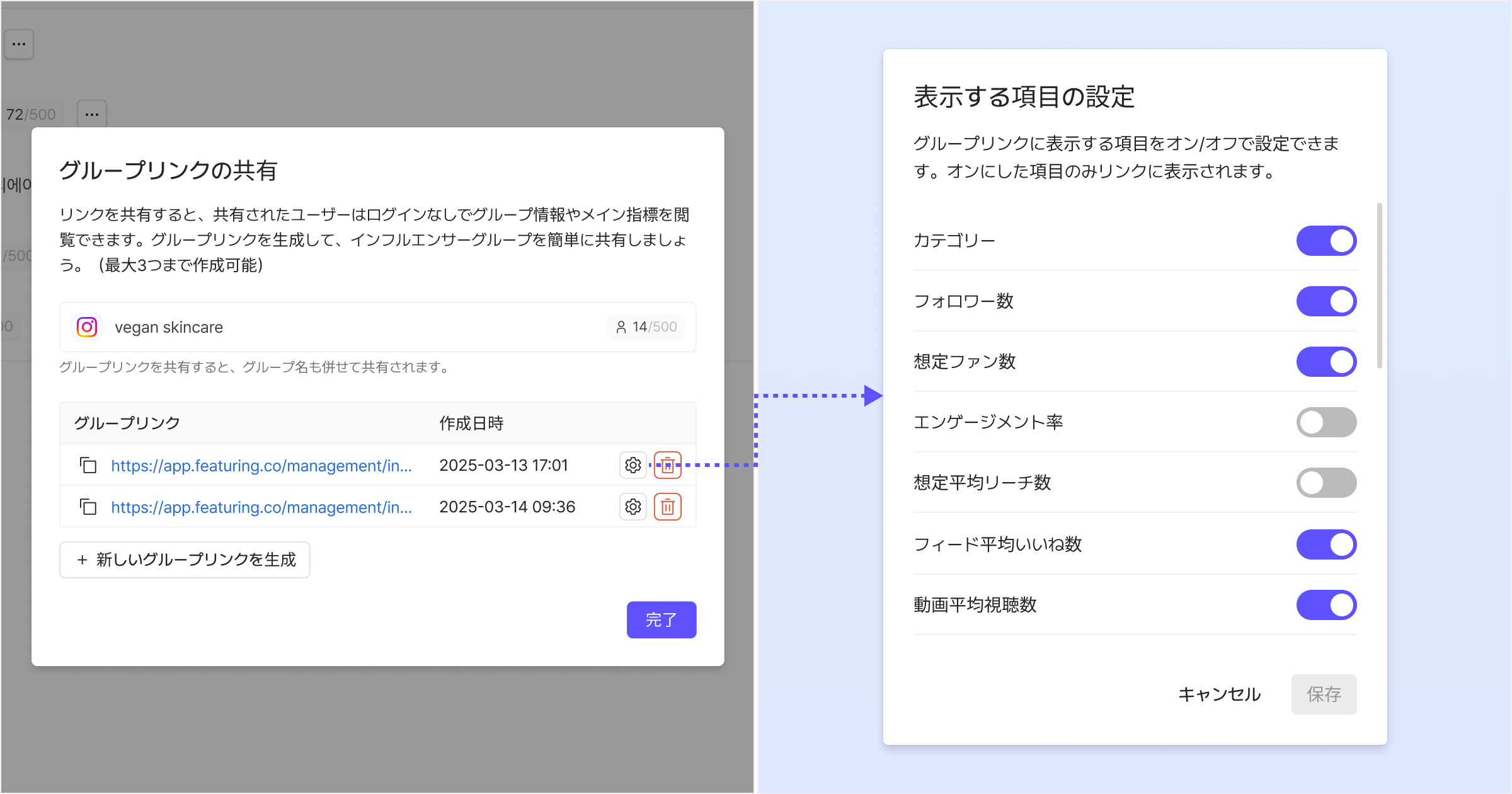 カスタム項目を作成すると、グループリンク共有モーダル内で表示する項目を個別に設定できます。