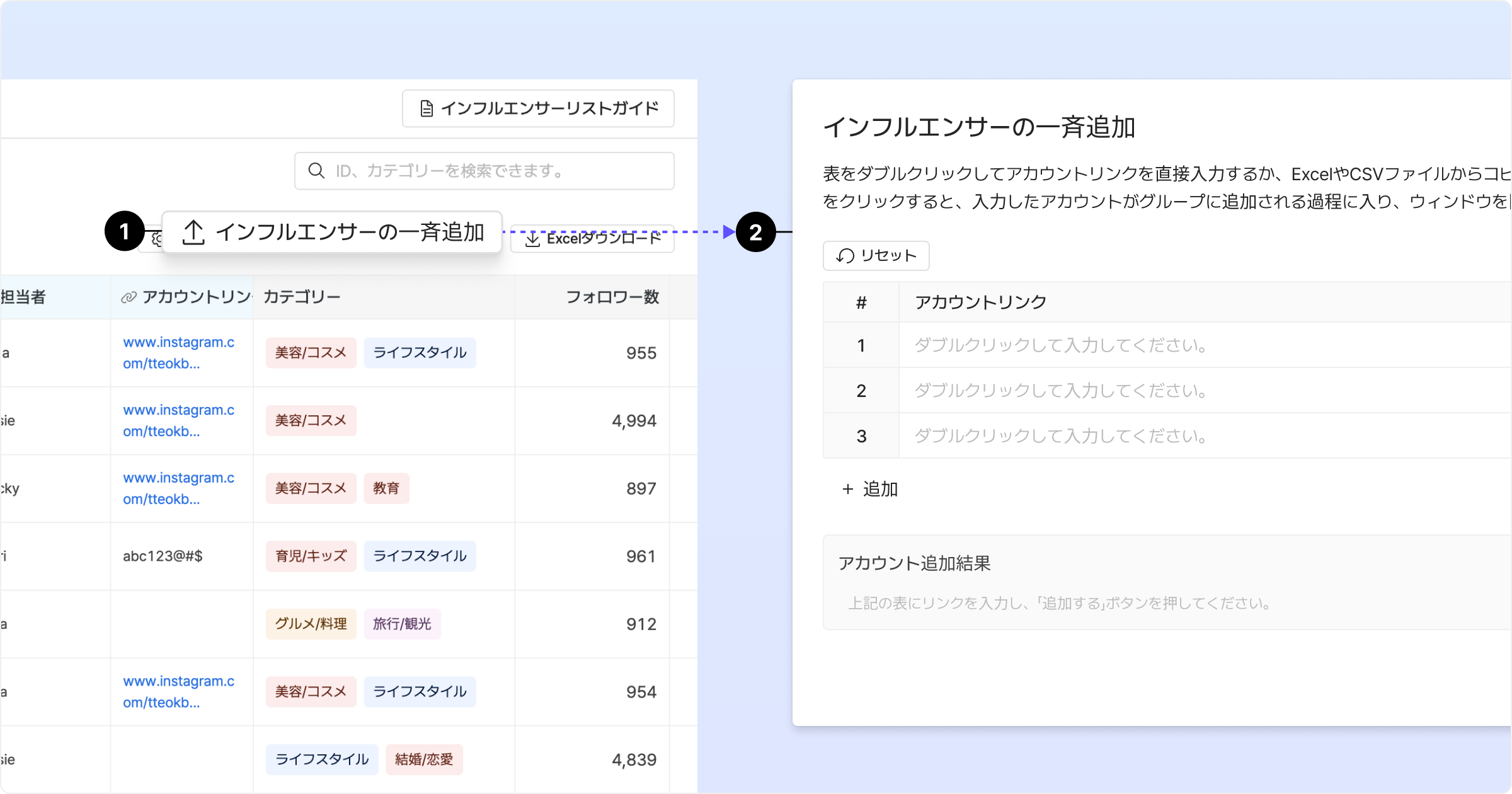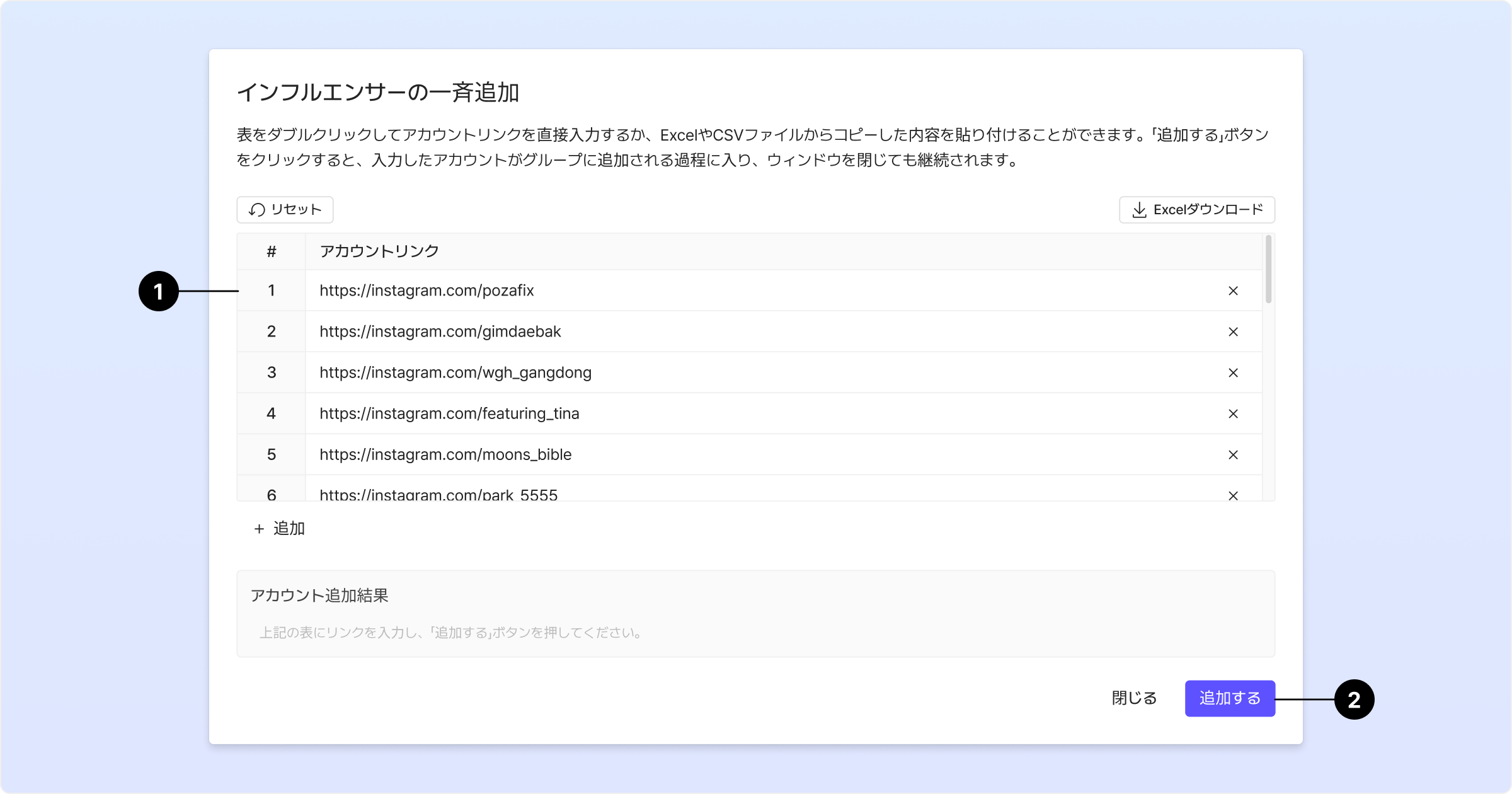 ❶表にインフルエンサーのアカウントリンクを入力し、❷「追加」ボタンをクリックすると、追加されたアカウントが表示されます。