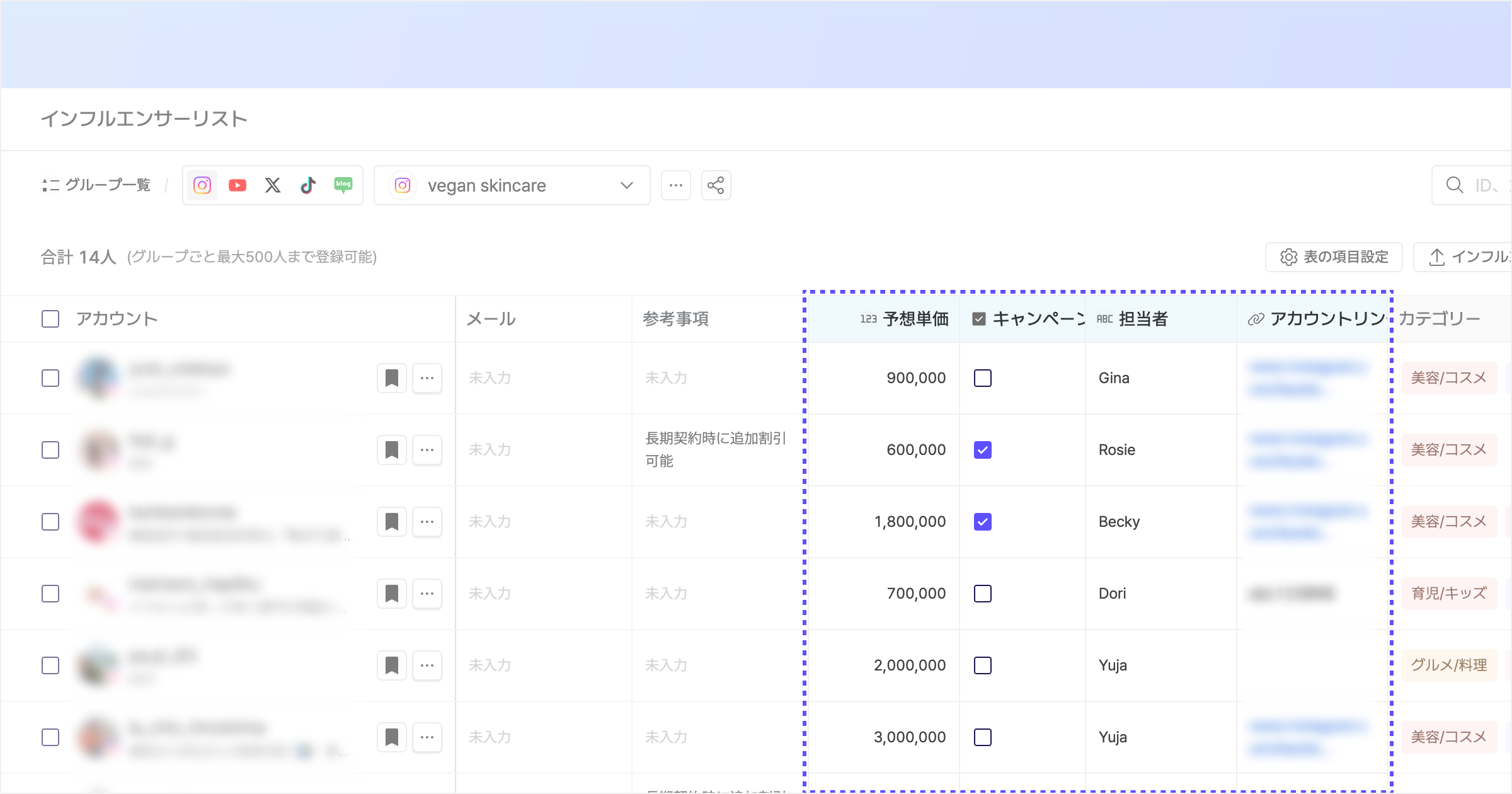 インフルエンサー管理では、グループごとにカスタム項目を作成・管理することができます。