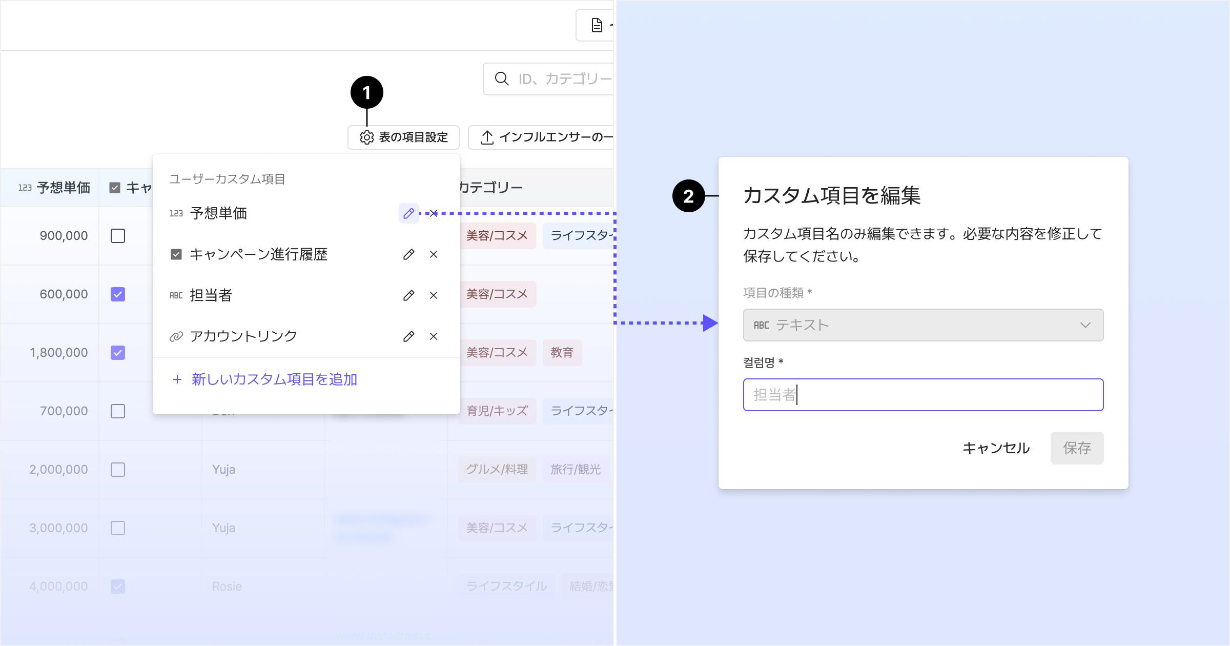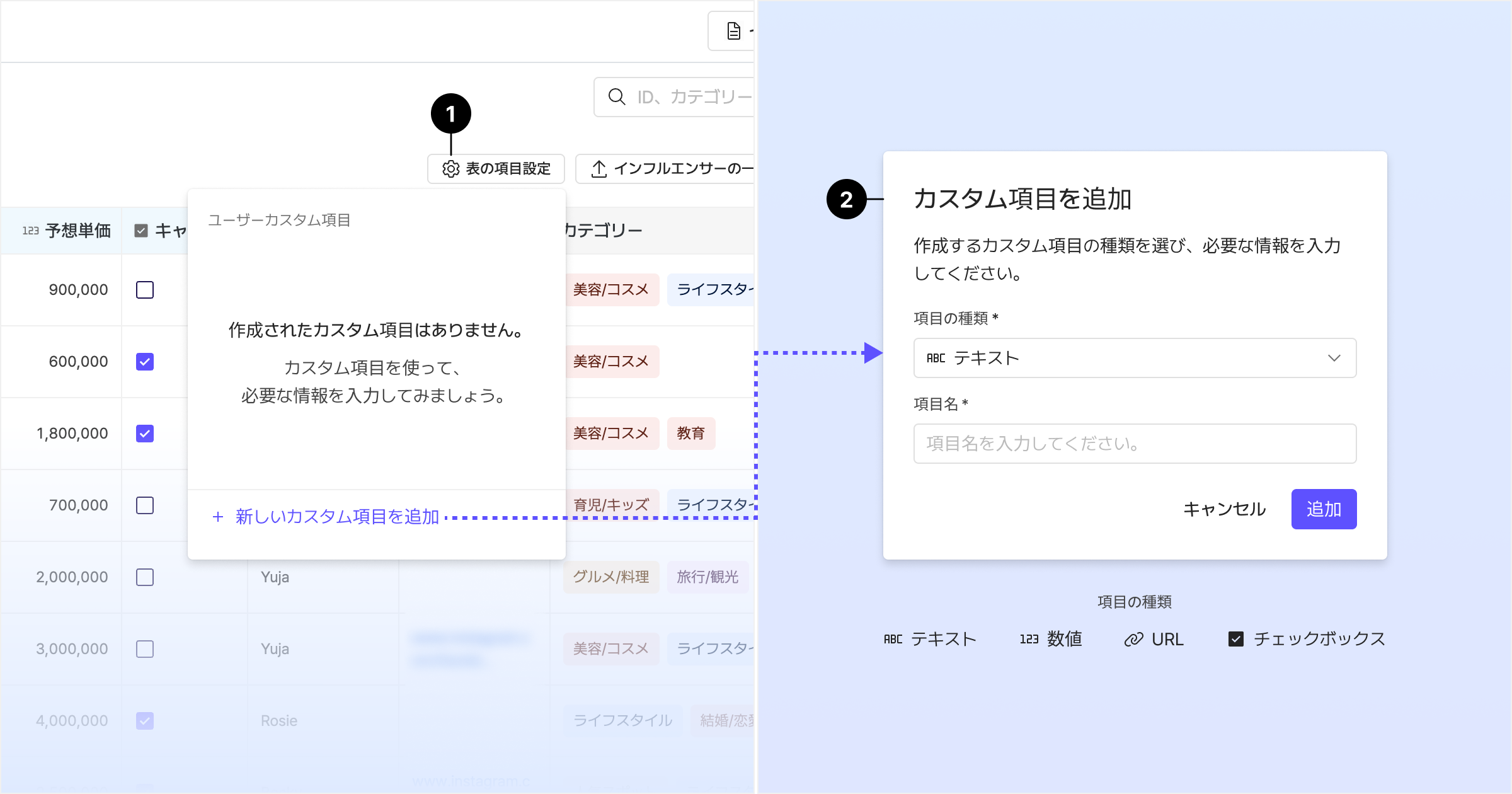 ❶表の項目設定ボタンをクリックし、新しいカスタム項目を追加を選択します。❷使用したい項目の種類を選び、項目名を入力してください。
