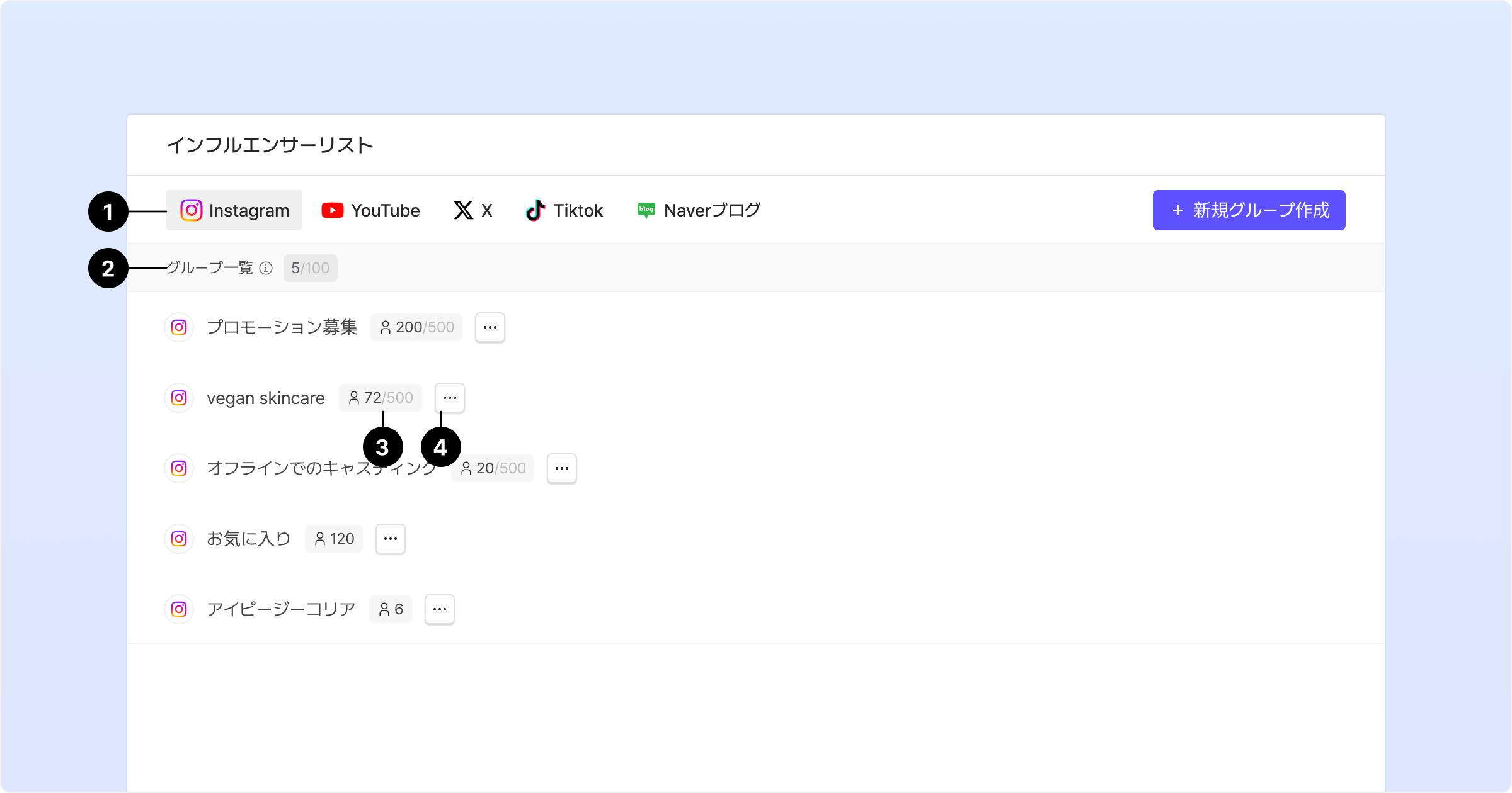 ❸ グループ内の保存されたインフルエンサー数各グループに含まれているインフルエンサーの数を一目で確認できます。