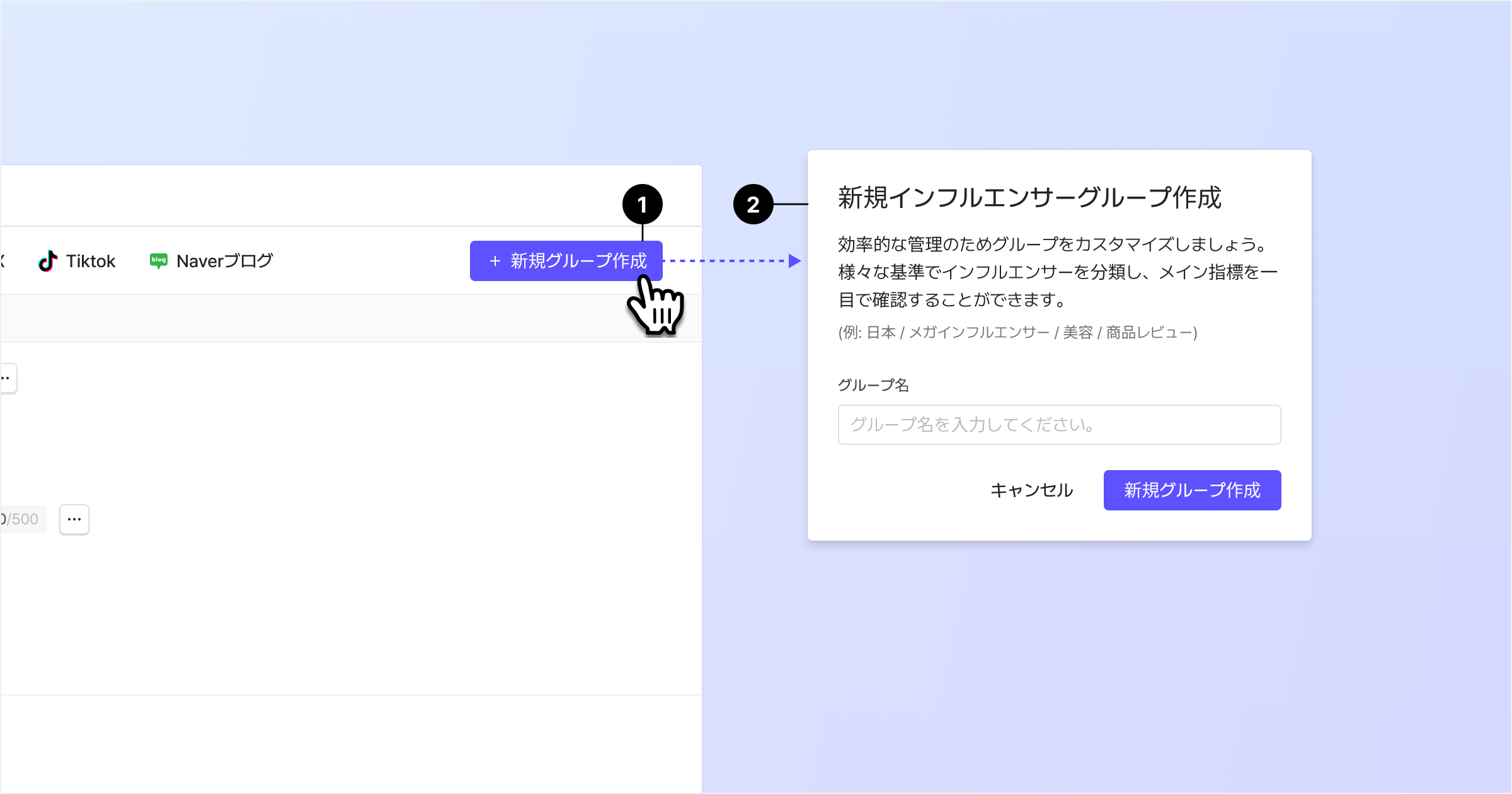 ❷ 「新規インフルエンサーグループ作成」画面でグループ名を入力し、「新規グループ作成」ボタンをクリックすると作成が完了します。