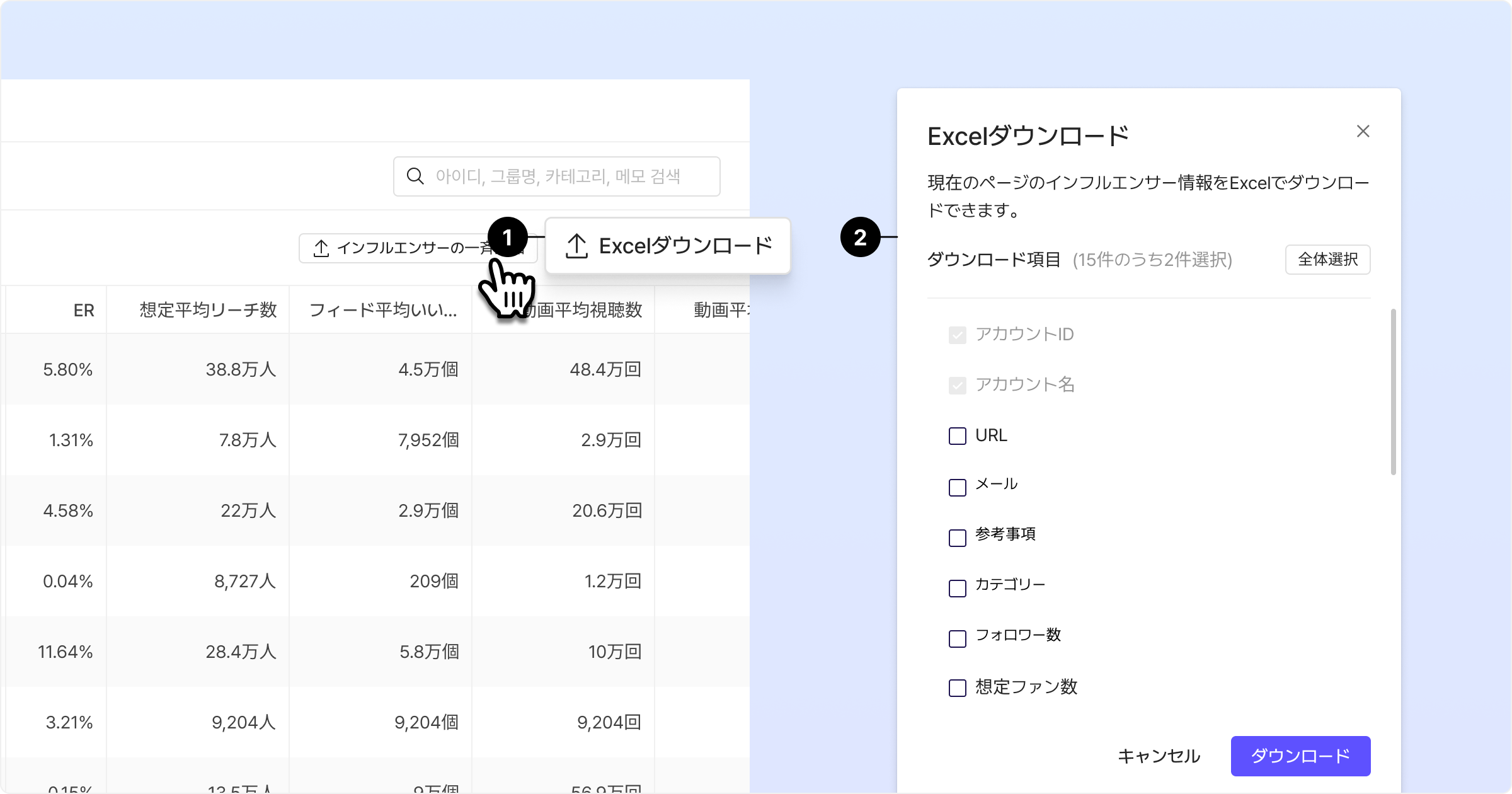 ❶ 「Excelダウンロード」ボタンをクリックし、❷ 「Excelダウンロード」画面で必要なカラムを選択すると、現在のページのインフルエンサー情報をExcelファイルとしてダウンロードできます。
