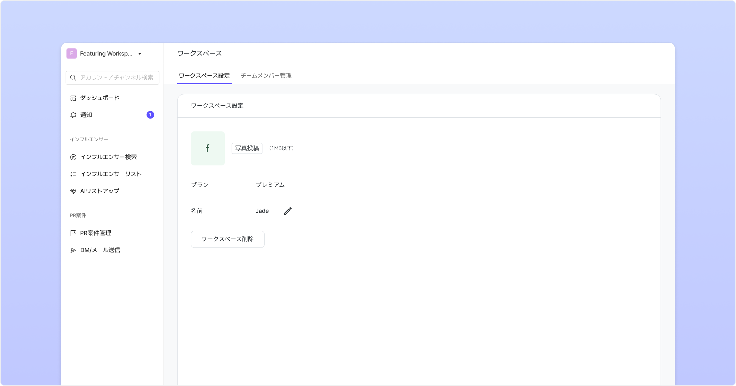 ワークスペースは、チームメンバーと一緒にインフルエンサーや案件を効率的に管理できる空間です。ワークスペースごとにメンバーシップが適用され、柔軟な運用が可能です。