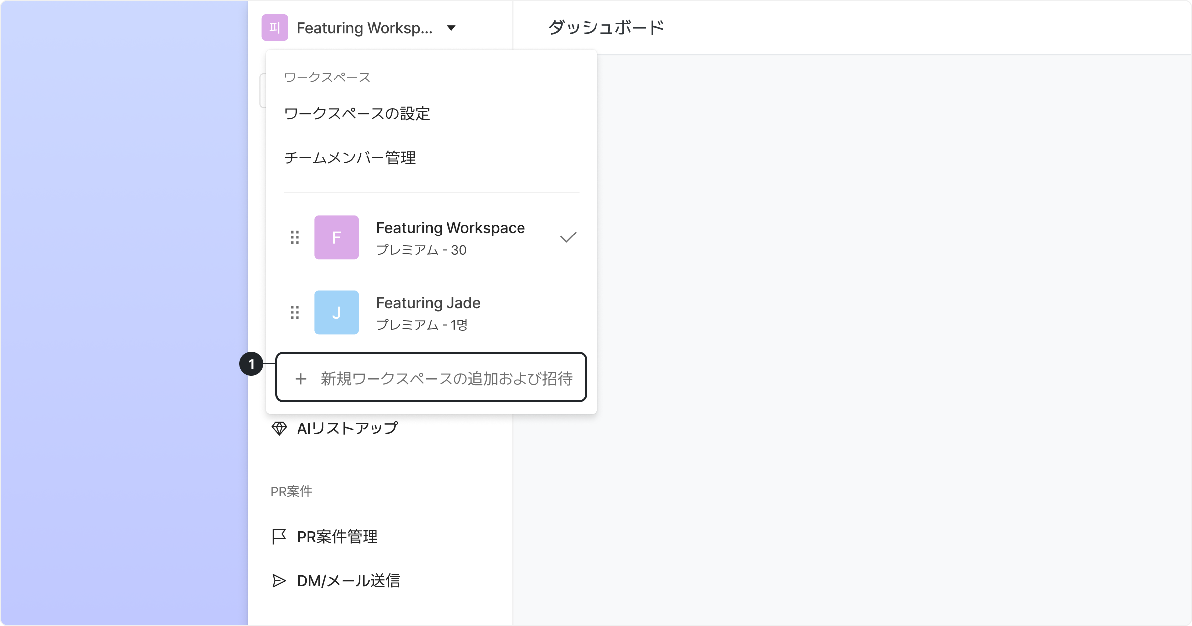 ❶ 新規ワークスペースの追加および招待をクリック