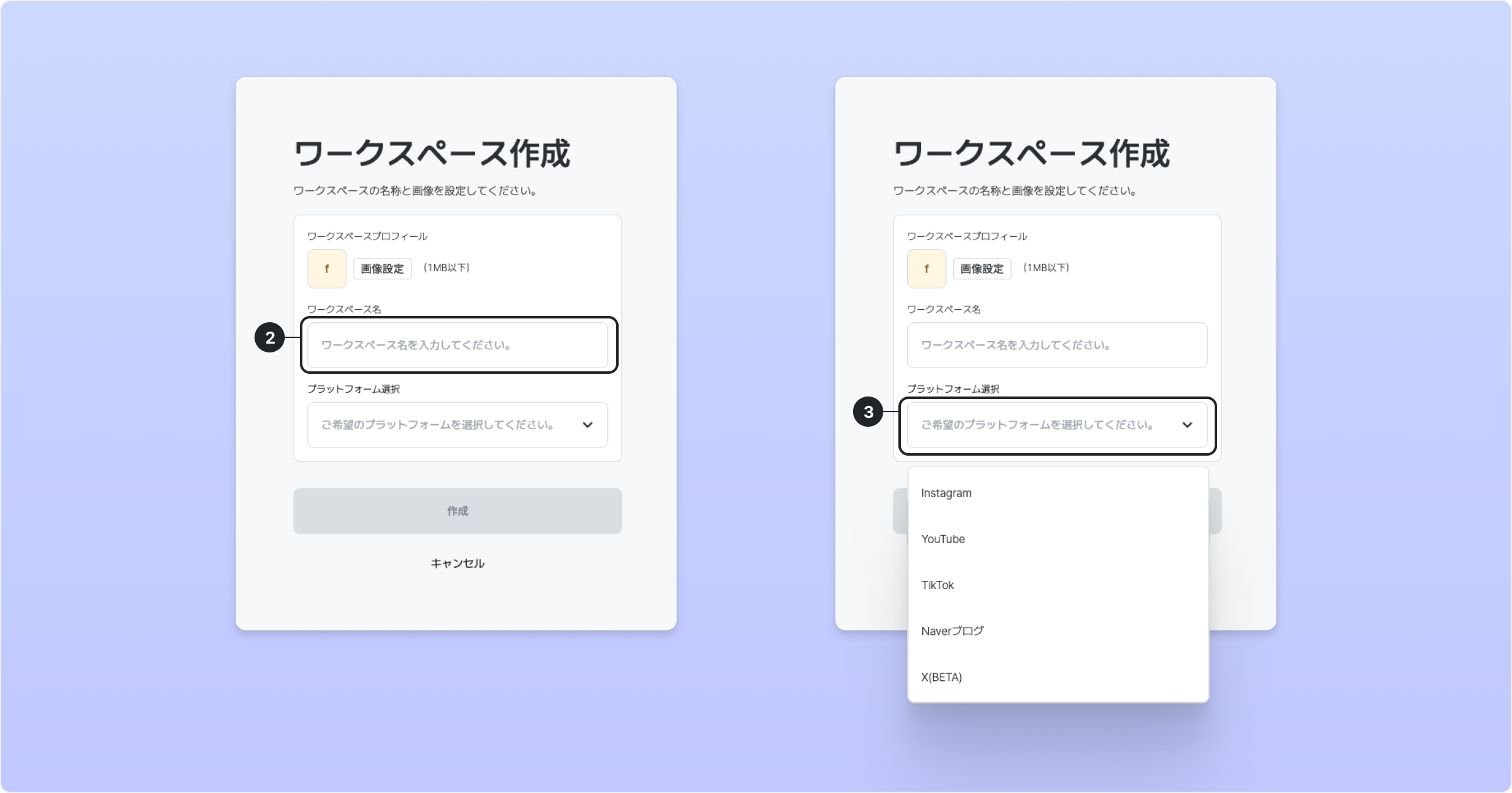 ❷ ワークスペース名を入力 ❸ プラットフォーム選択後、作成をクリック