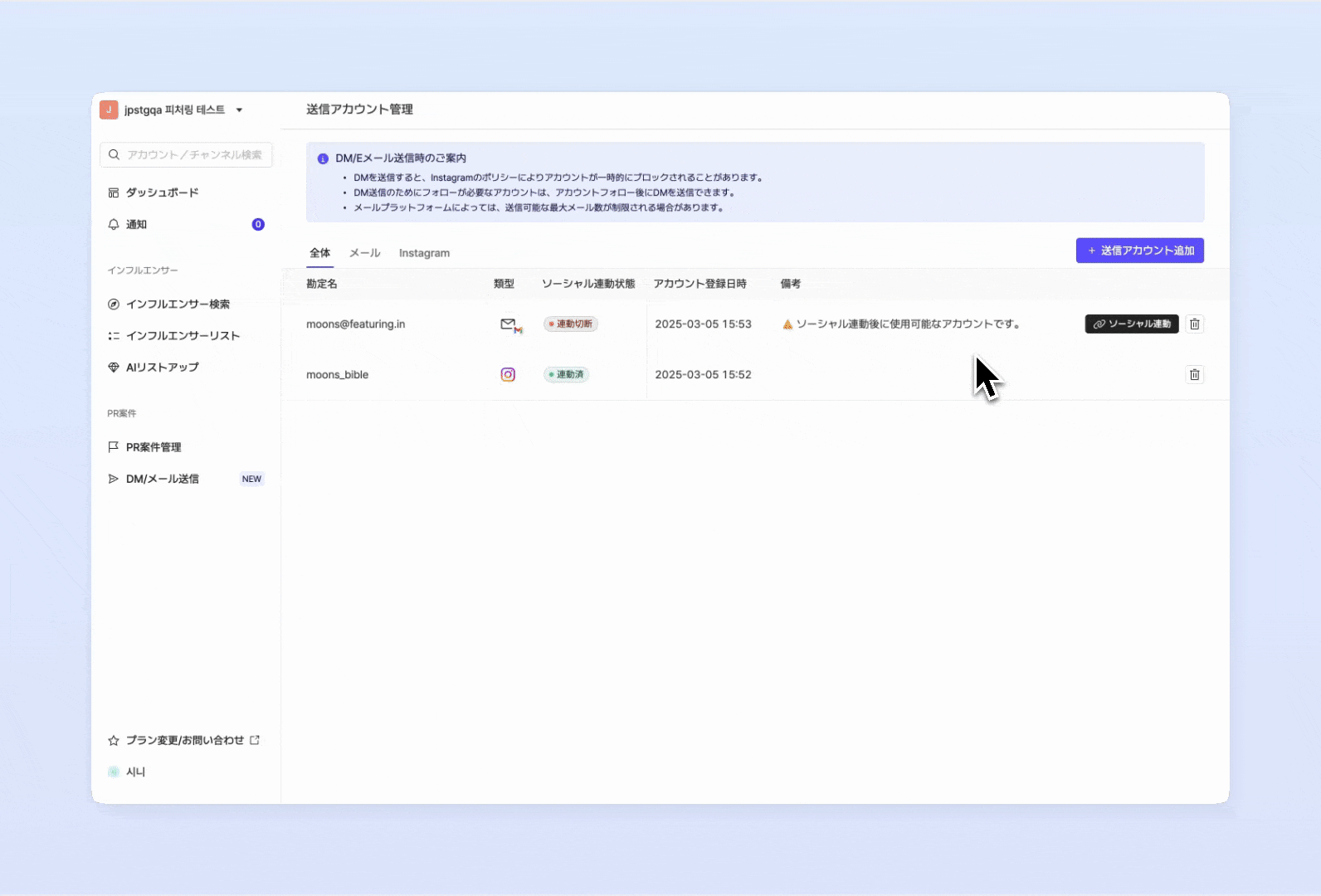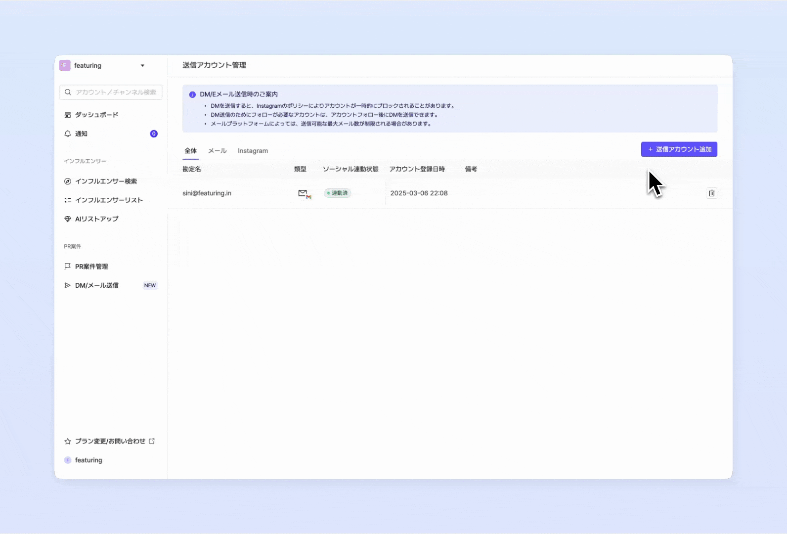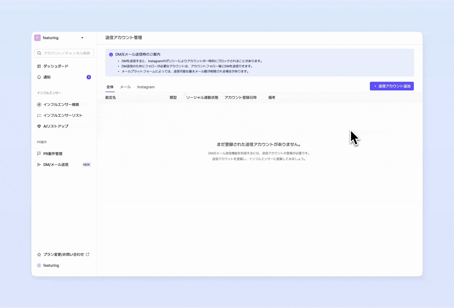 インフルエンサーにDMまたはメールを送信するには、まず初めに送信元アカウントを登録する必要があります。現在、Instagramアカウントまたはメールアカウントのいずれかを選択して追加できます。