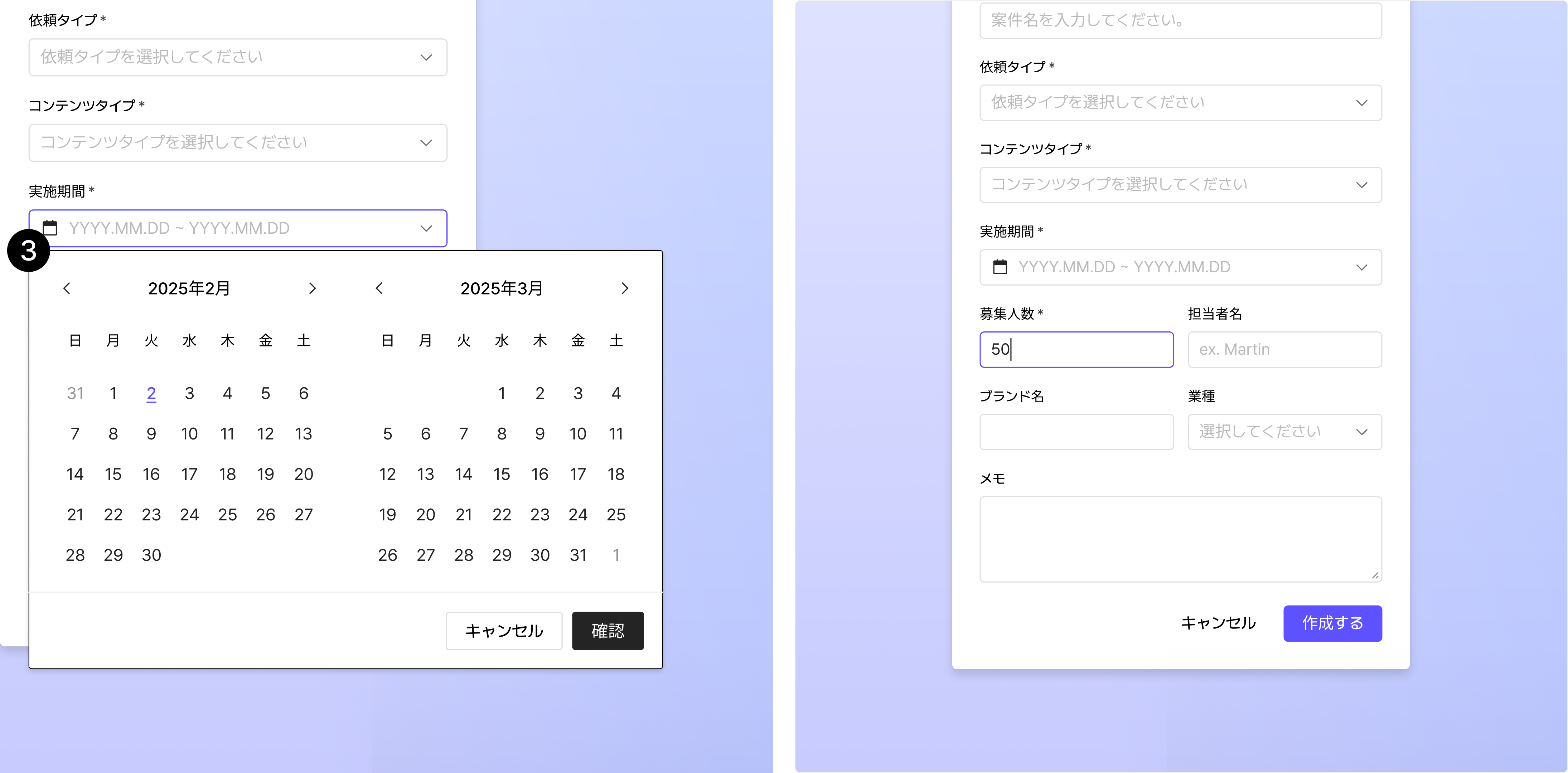 ❸ 実施期間を設定後、❹ 募集人数を入力します。