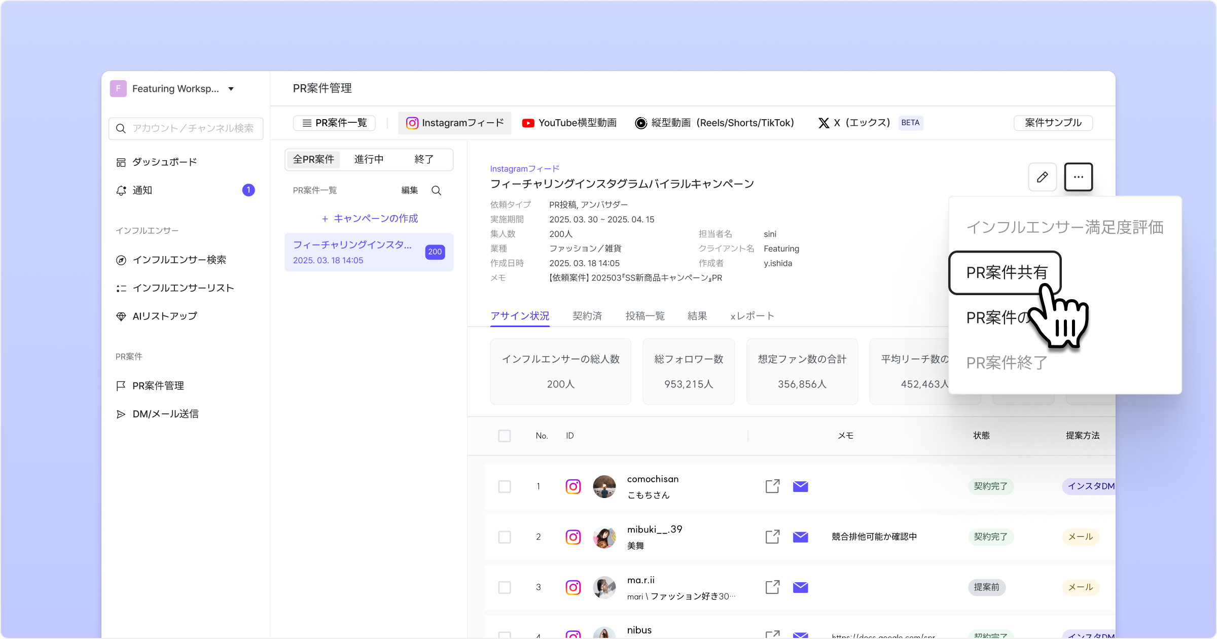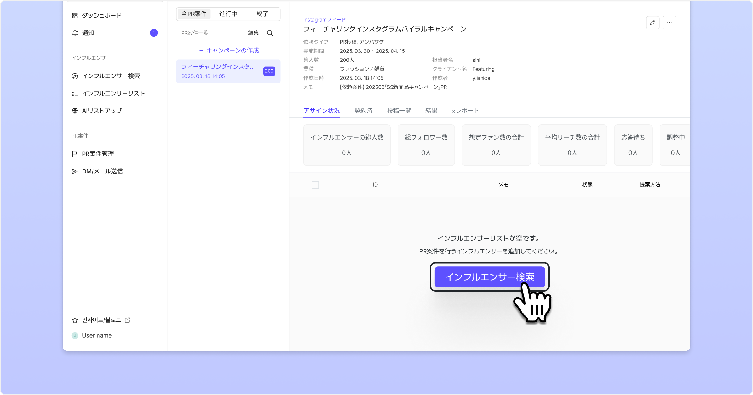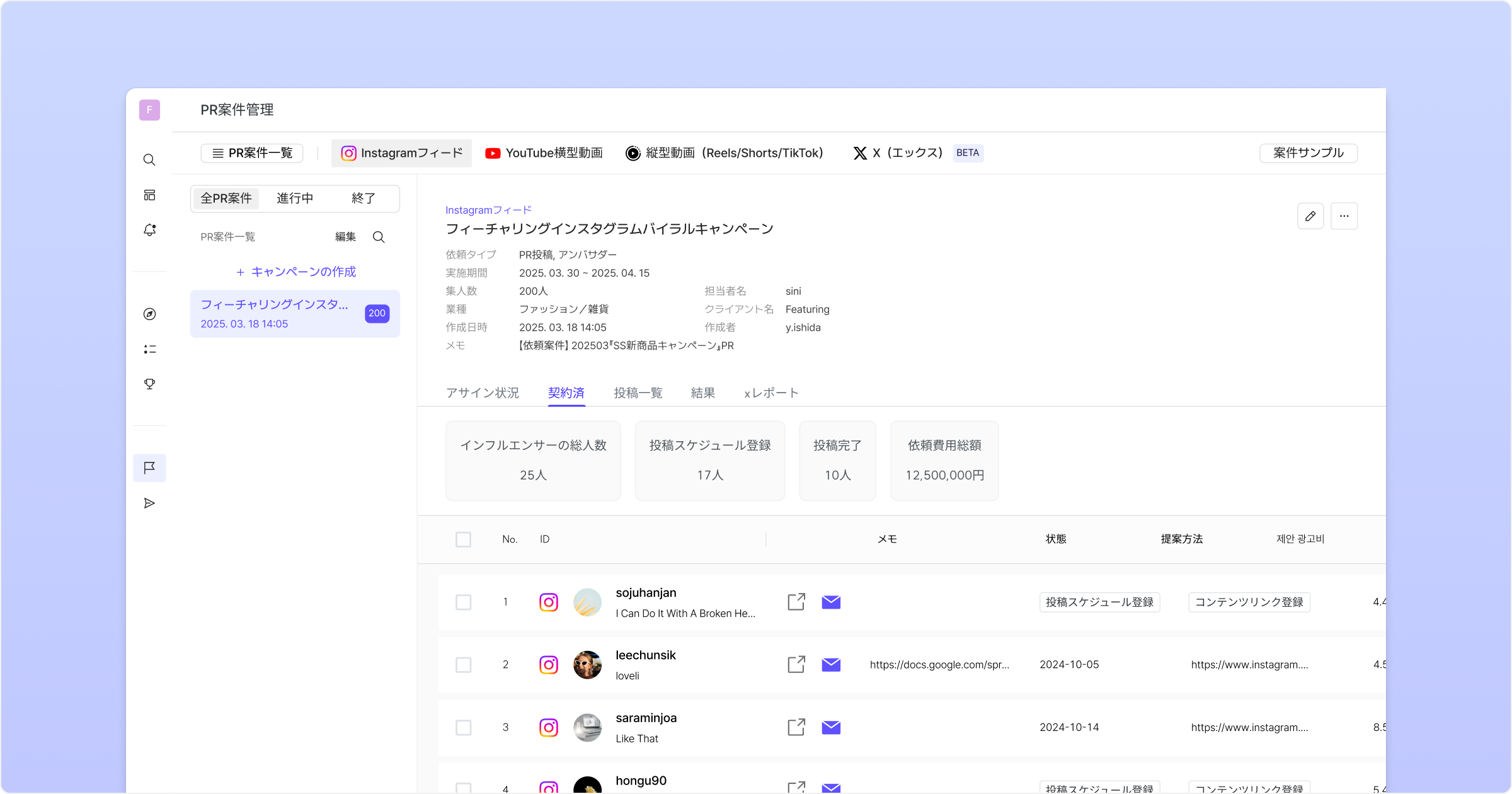 PR案件に追加されたインフルエンサーのリストを確認できるタブです。インフルエンサーの提案、契約状況、提案方法、提案広告費などを一括で管理できます。