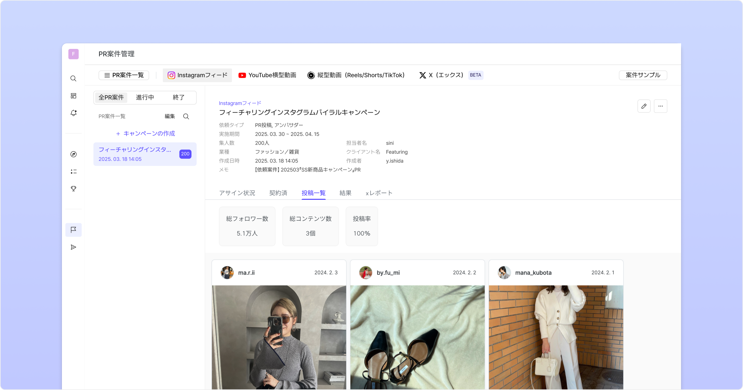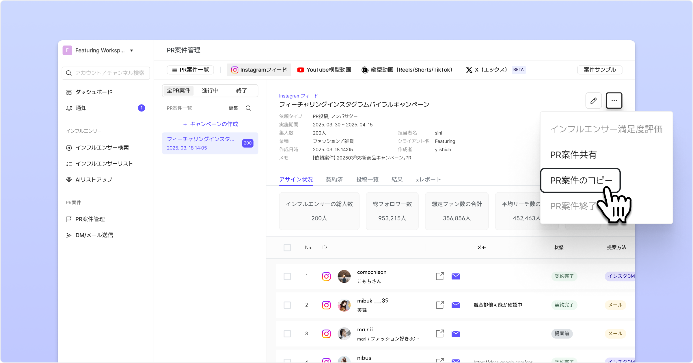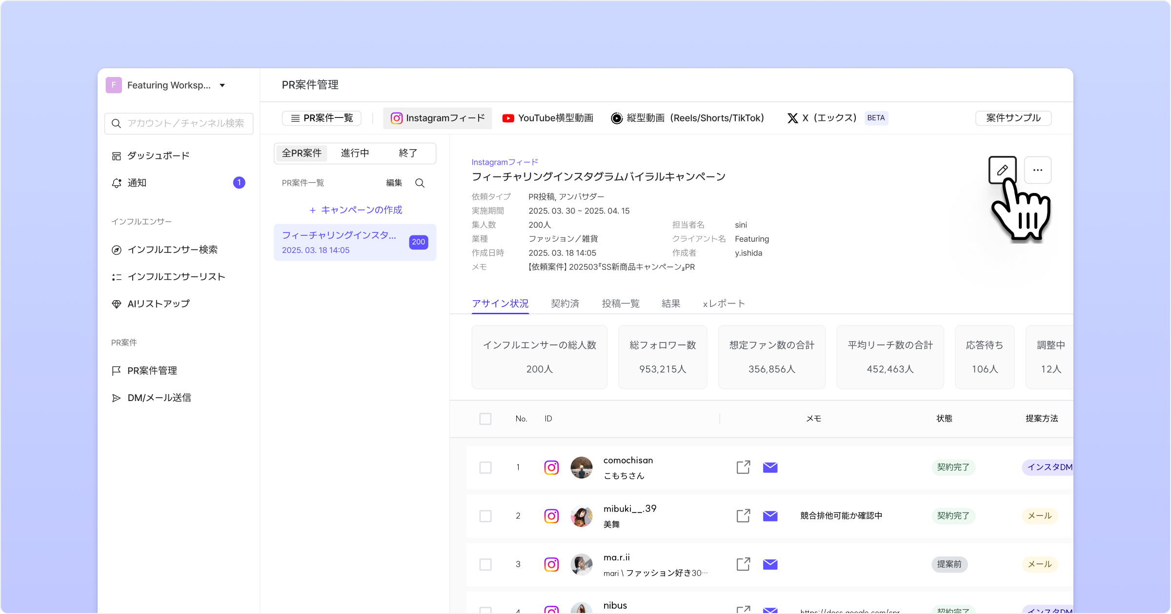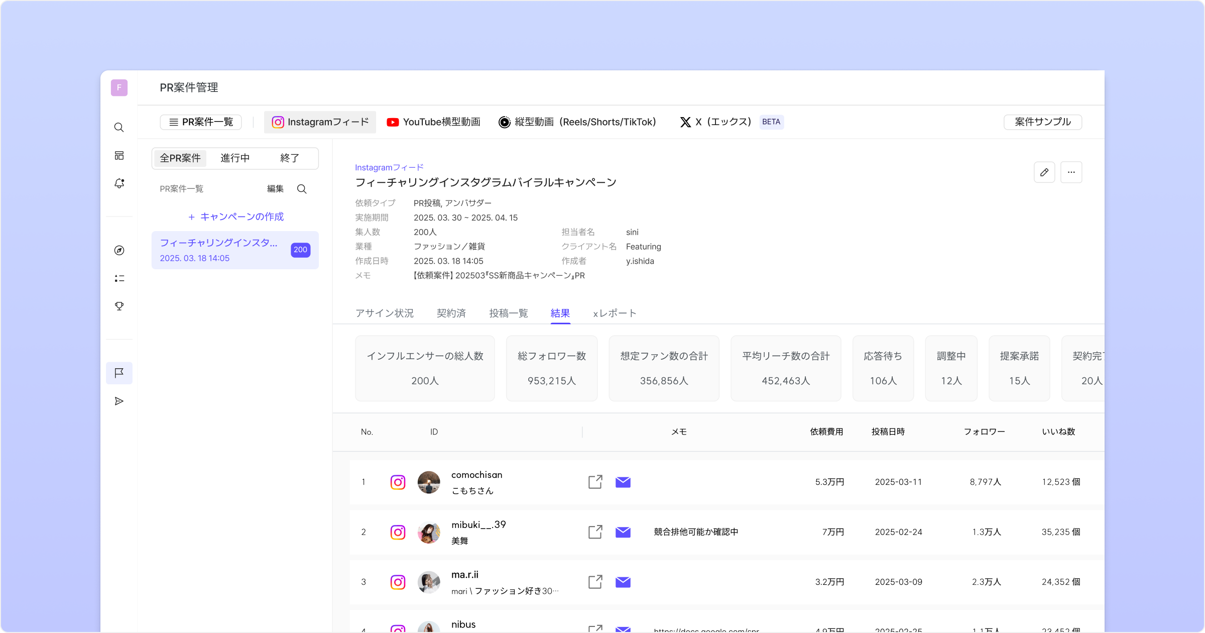 PR案件に追加されたインフルエンサーのリストを確認できるタブです。インフルエンサーの提案、契約状況、提案方法、提案広告費などを一括で管理できます。