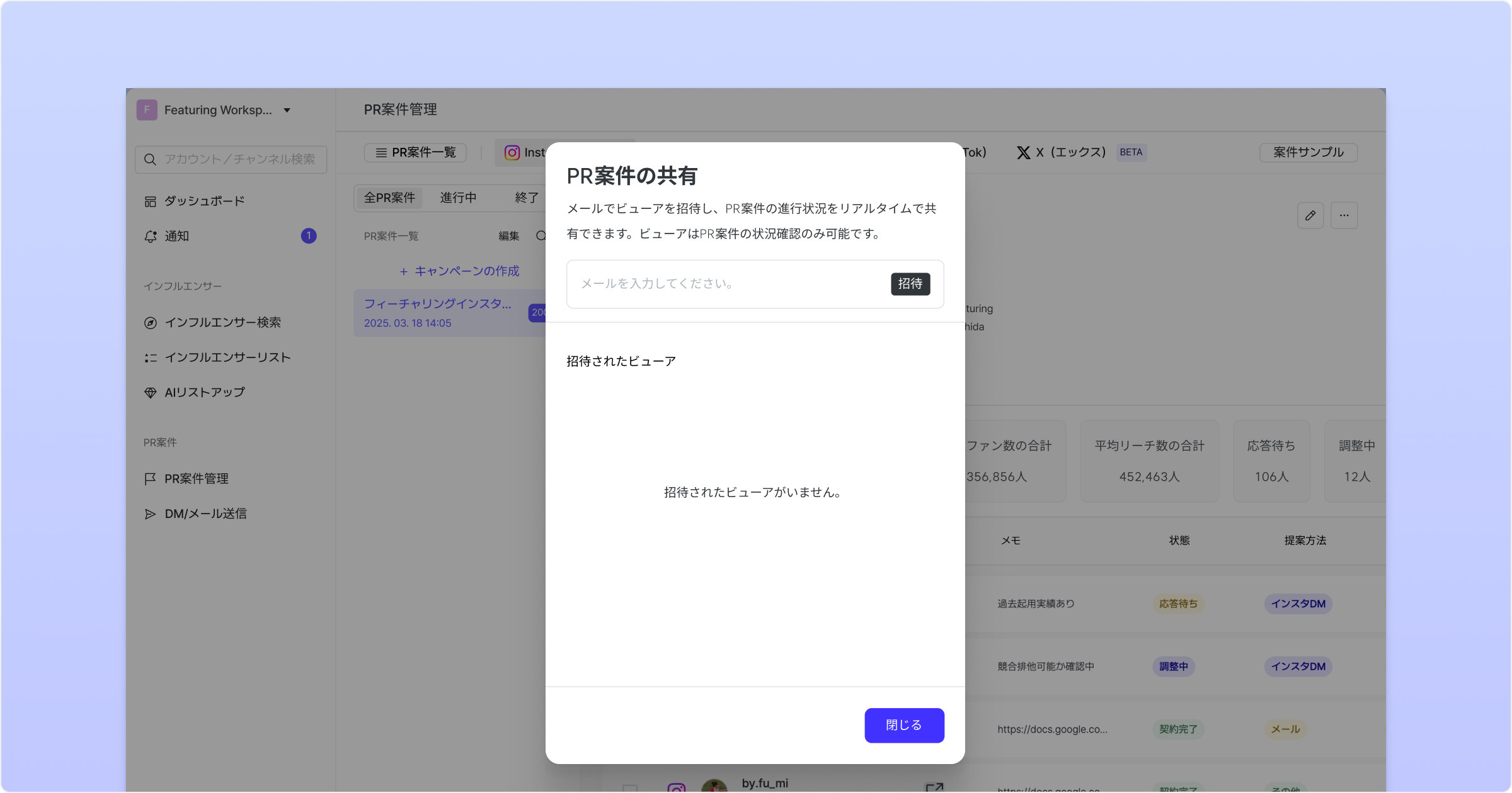 招待されたメールアドレス宛にPR案件状況ページのリンクが共有され、リンクへアクセスするとビューア権限でPR案件状況を確認できます。※フィーチャリングサービスを利用していない人のメールアドレス(会社メールのみ可)にもPR案件リンクを共有できます。