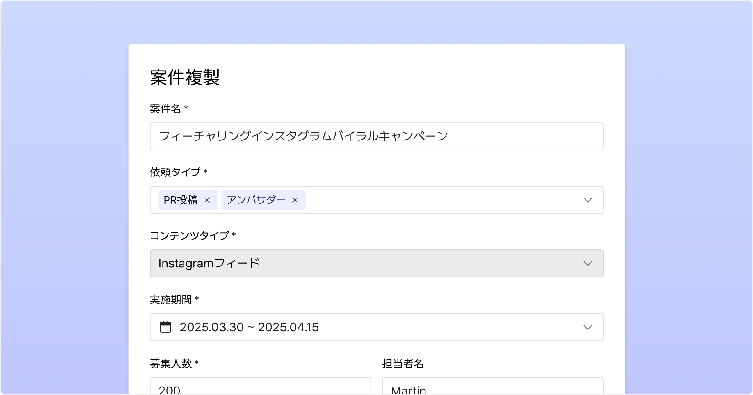 右側の「…(詳細)」アイコンをクリックし、「PR案件のコピー」ボタンをクリックすると、PR案件を複製できます。