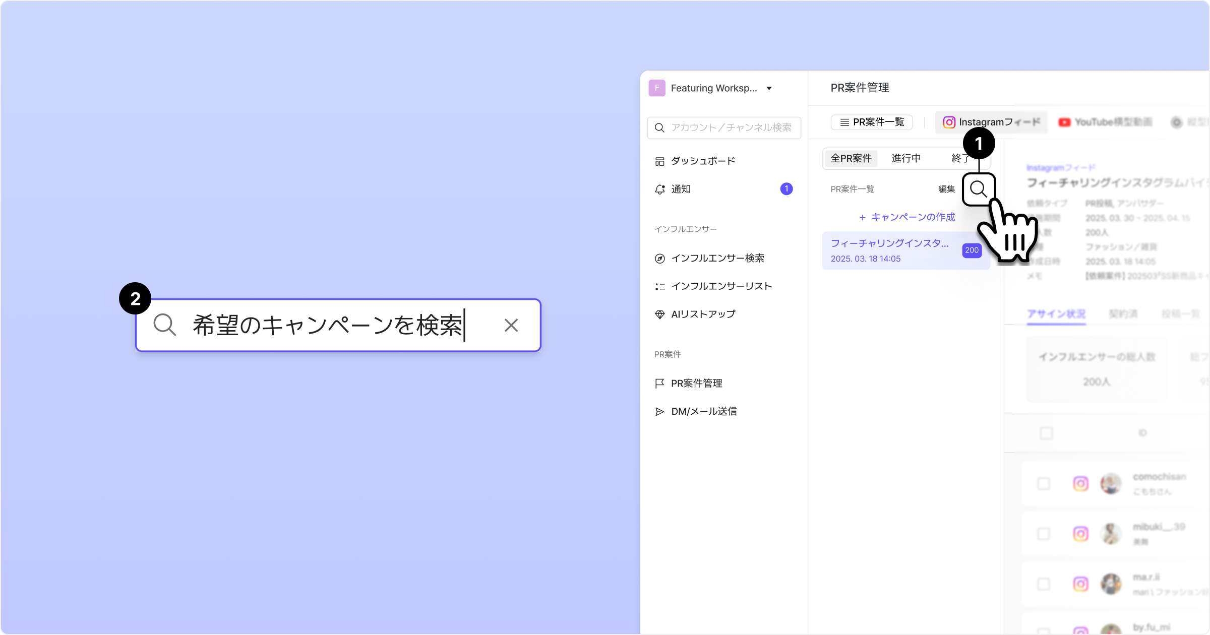 左側のPR案件リスト内で ❶ 検索アイコンをクリック → ❷ 検索バーにキーワードを入力すると、該当PR案件を検索できます。