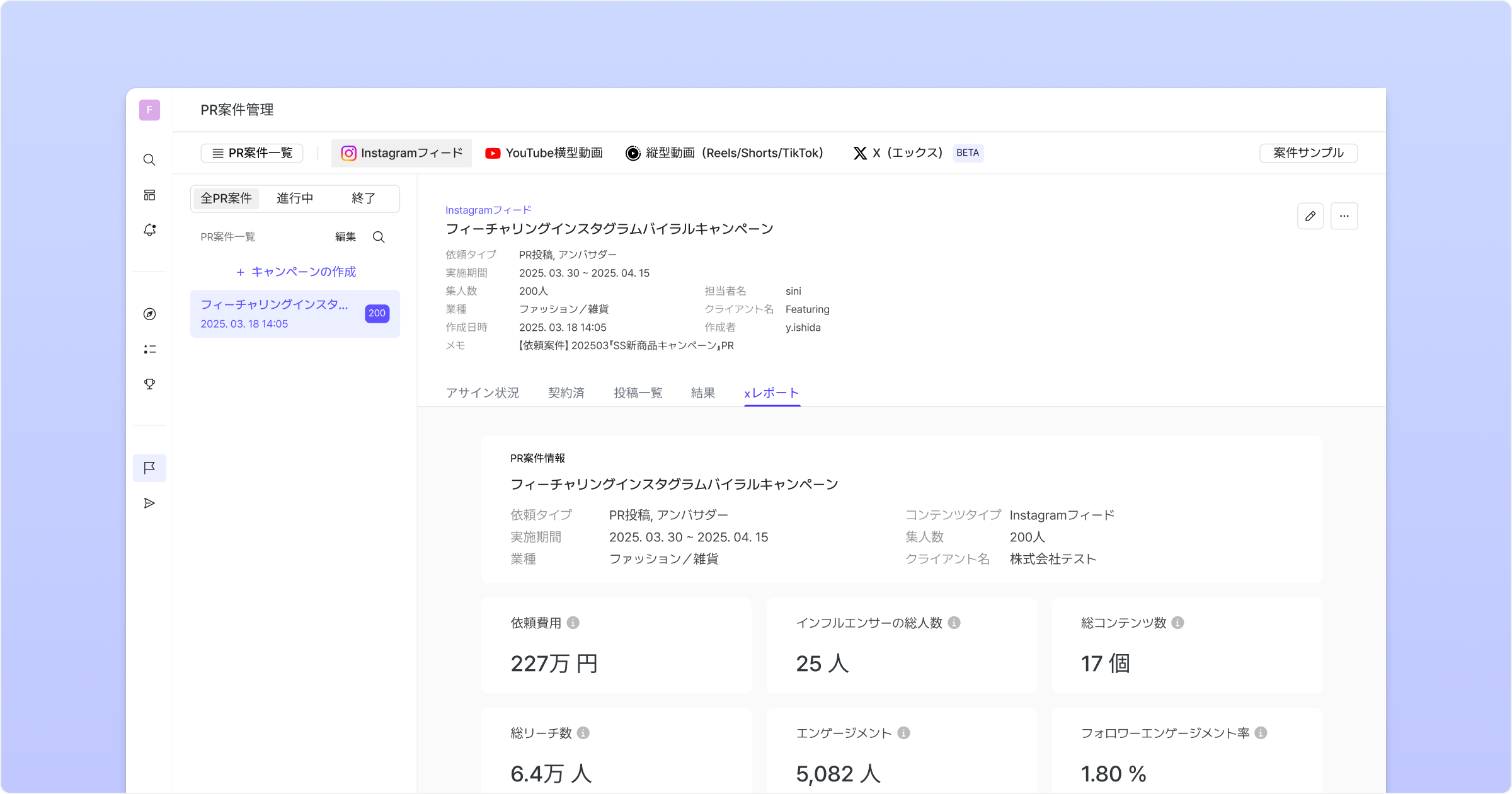 PR案件の進行結果を確認できるタブです。自動で収集されたデータを確認するだけでなく、インフルエンサーから直接収集したインサイト情報を入力し、より詳細なPR案件結果レポートを作成できます。