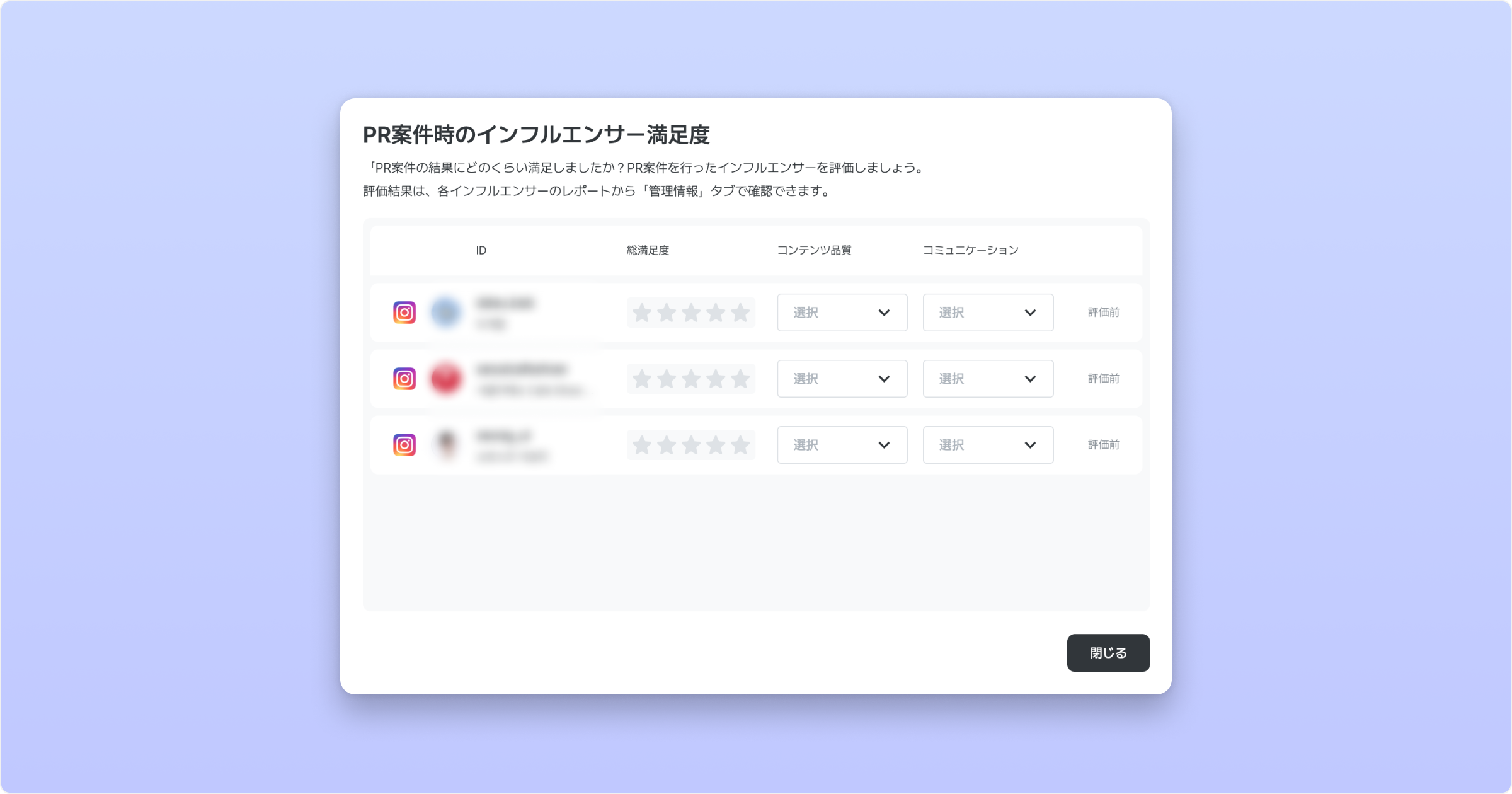 PR案件を進行したインフルエンサーのコンテンツ品質とコミュニケーション満足度を評価できます。