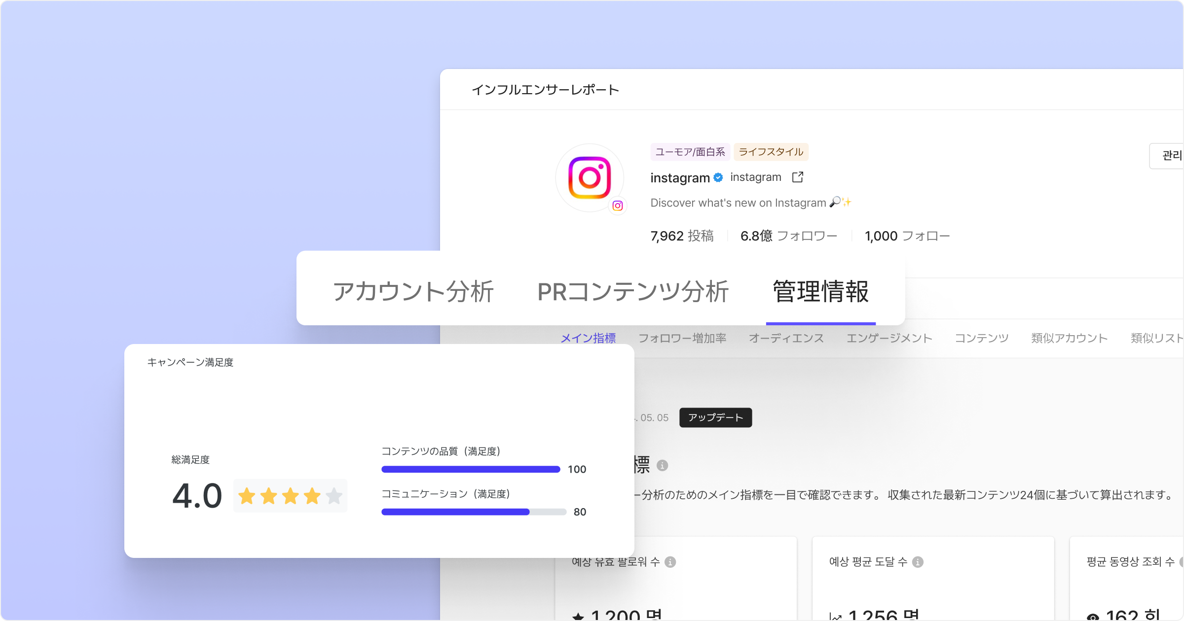 評価結果は各インフルエンサーのレポート内「管理情報」タブで確認できます。インフルエンサー別の平均PR案件満足度を参考にし、PR案件のアサイン判断に活用してください。