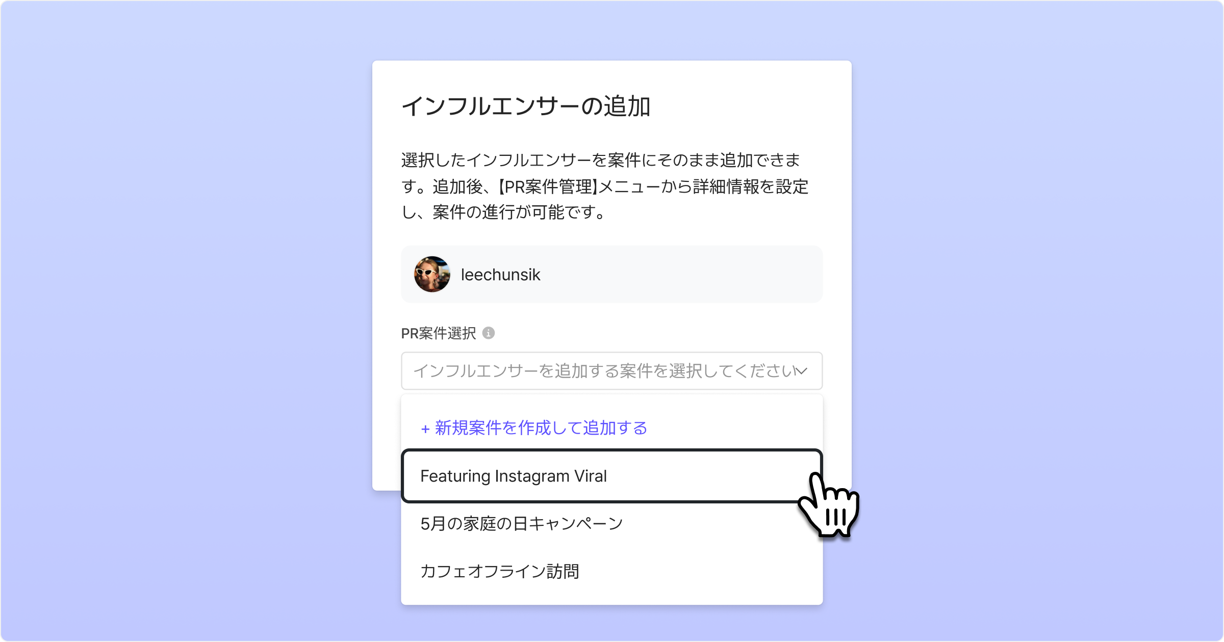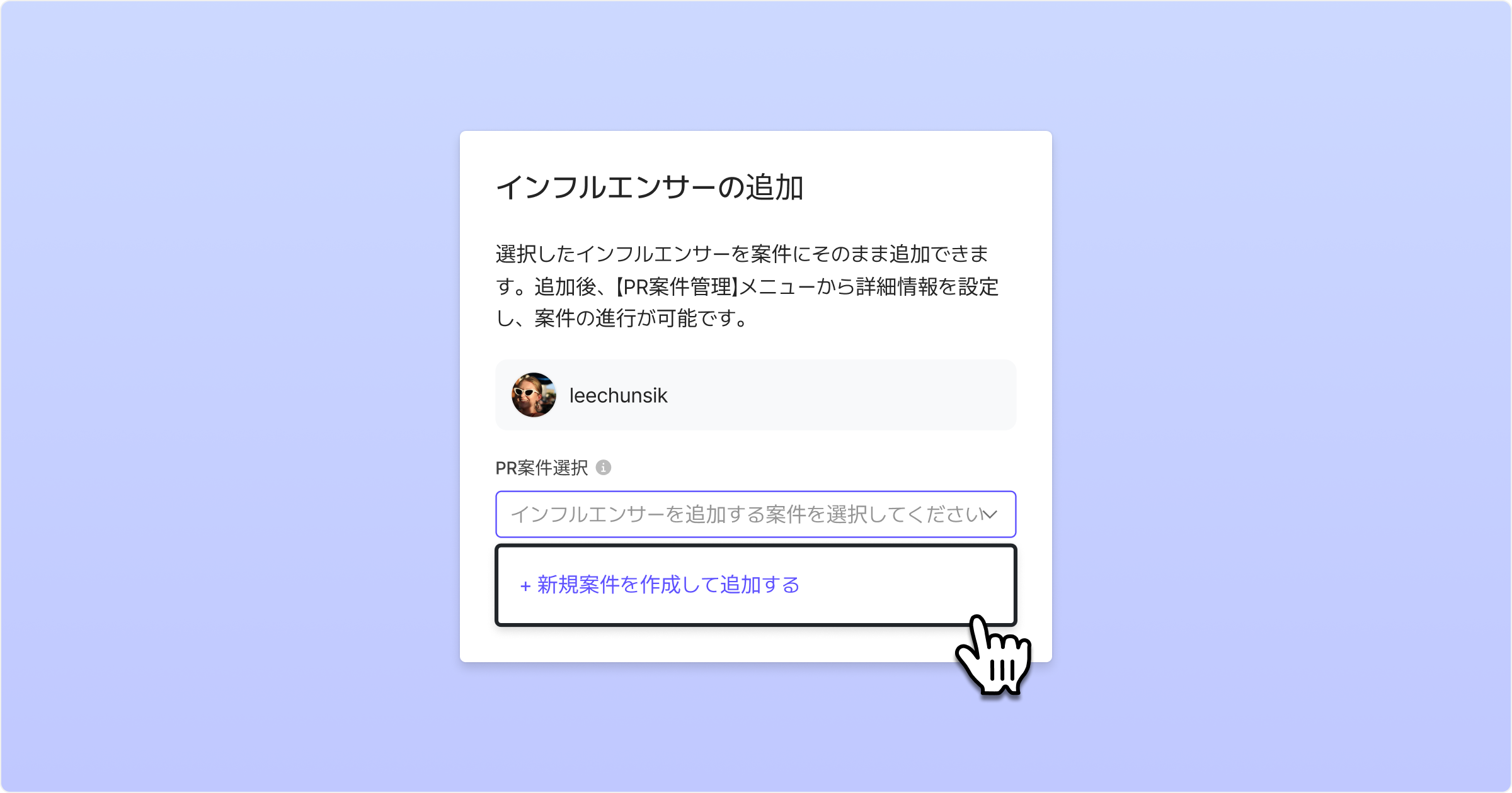 PR案件追加モーダルで、新規PR案件を作成または既存のPR案件を指定し、インフルエンサーをPR案件に追加できます。