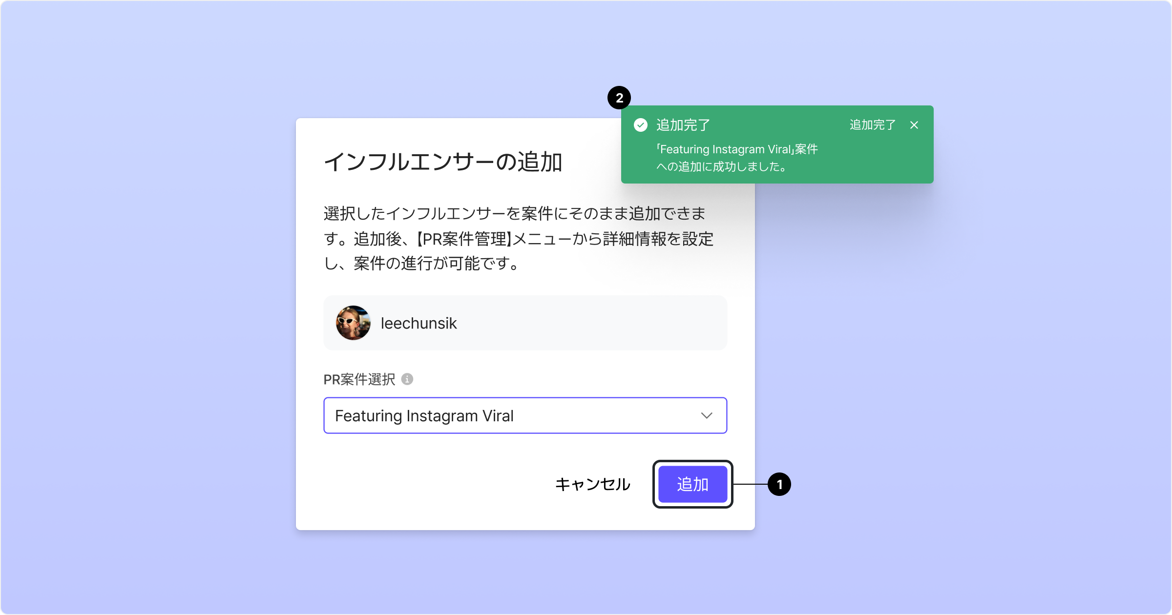 既存のPR案件を選択後、「追加」ボタンをクリックすると、選択したインフルエンサーがPR案件に即時追加されます。