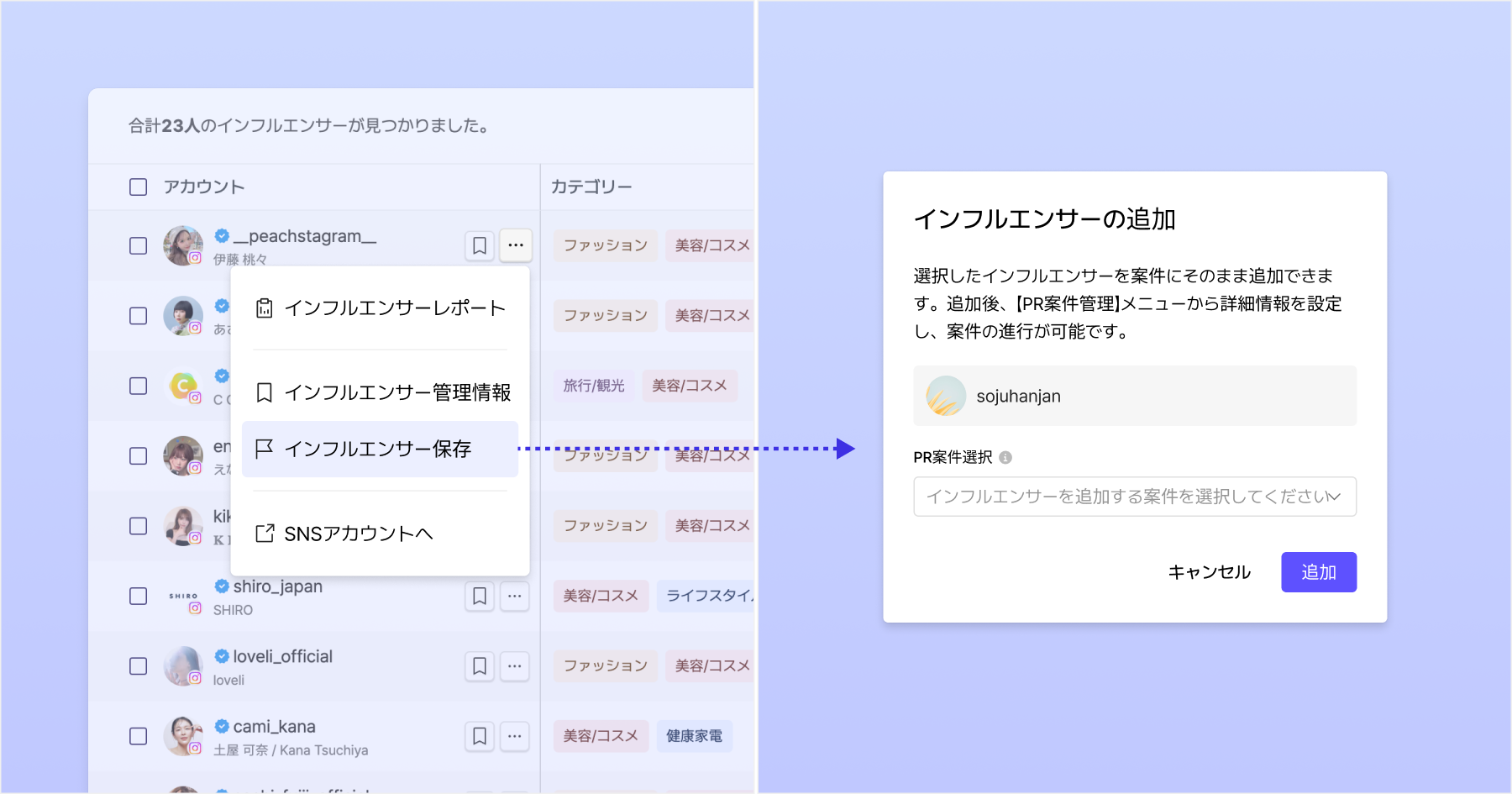 インフルエンサーレポート画面から、該当インフルエンサーを直接PR案件に追加できます。