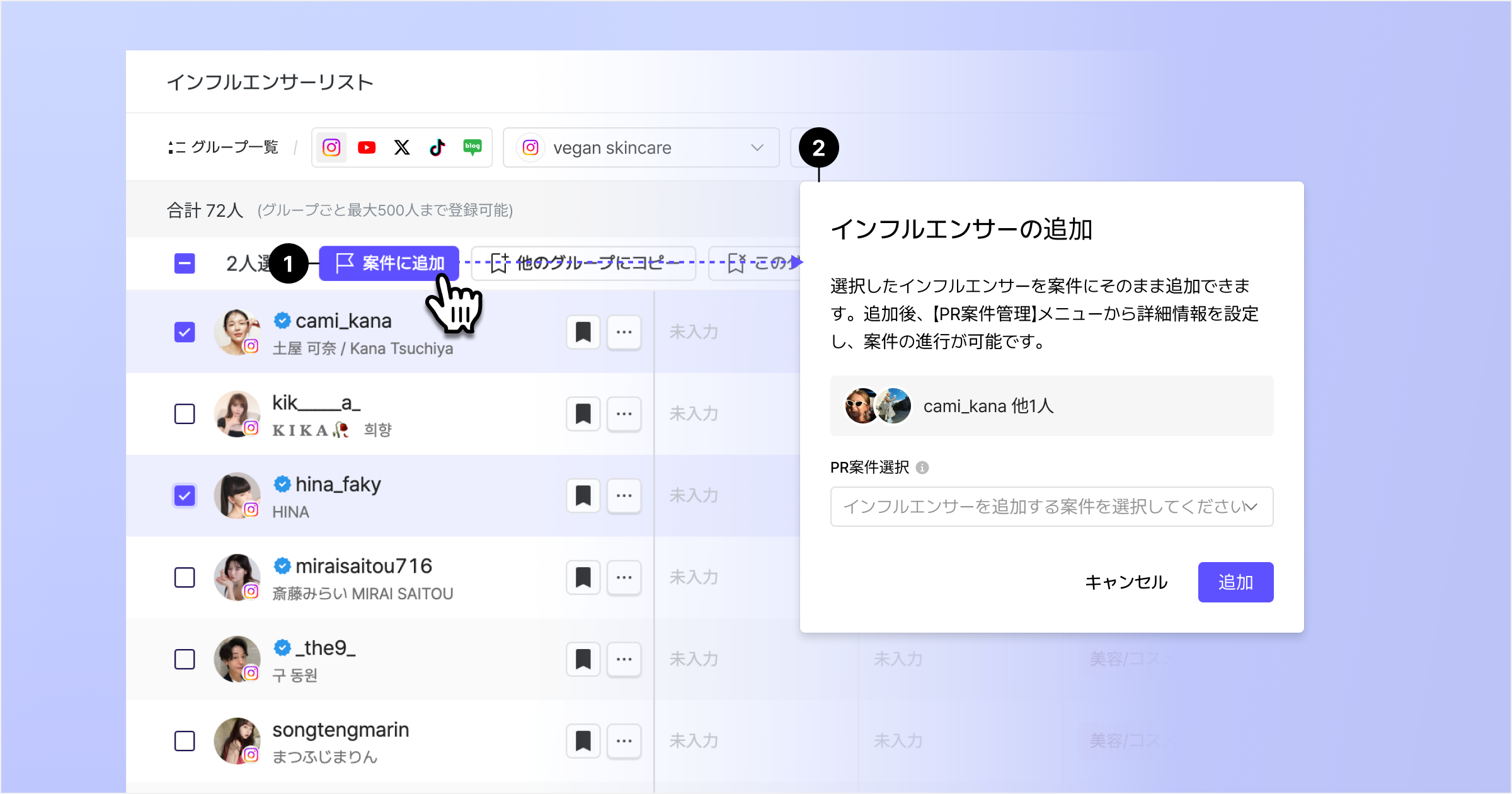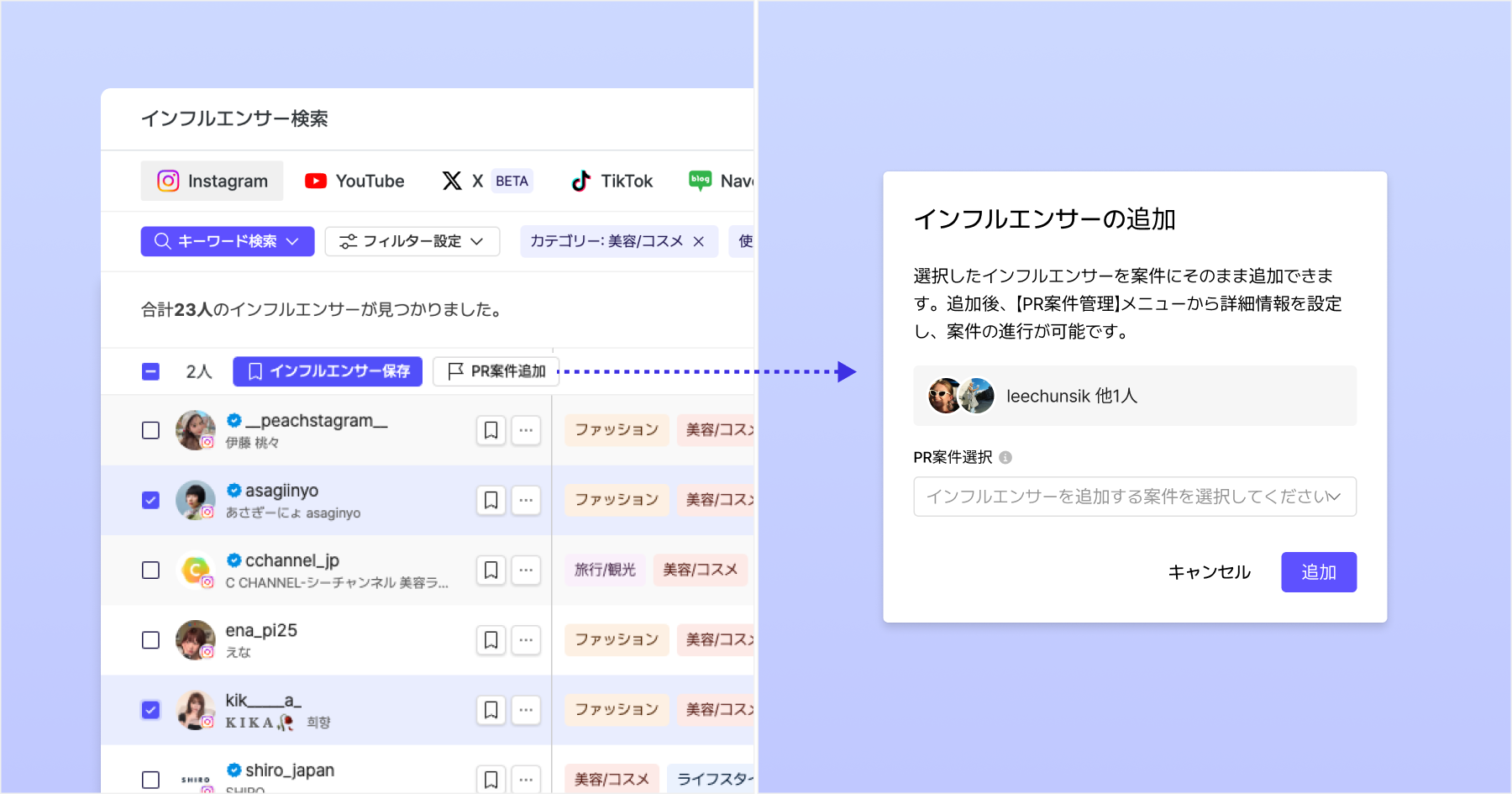インフルエンサー検索メニューからインフルエンサーをPR案件に追加できます。(単体/複数追加可能)