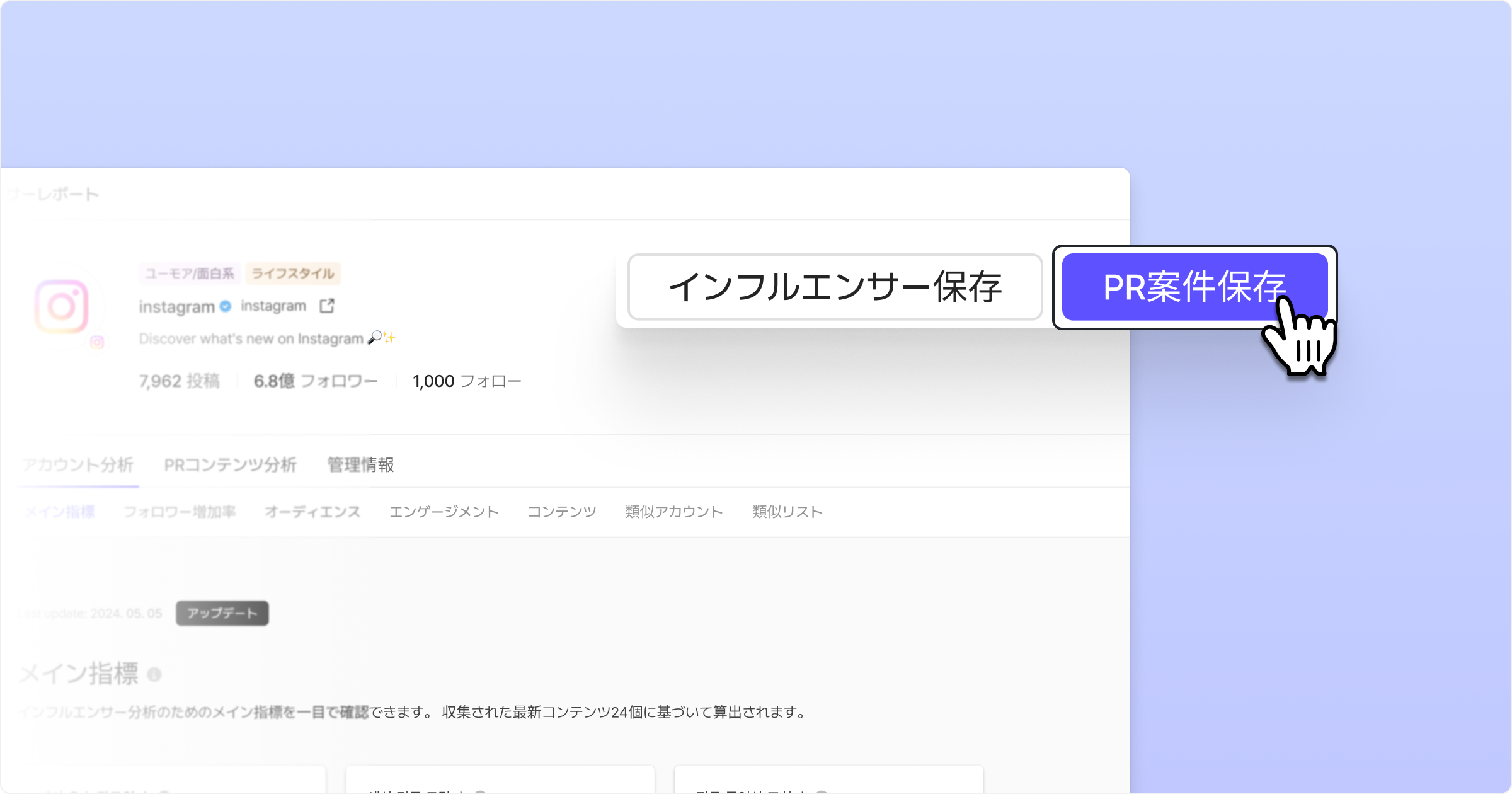 インフルエンサーレポートの上部にある「PR案件保存」をクリックすると、PR案件追加モーダルが表示されます。