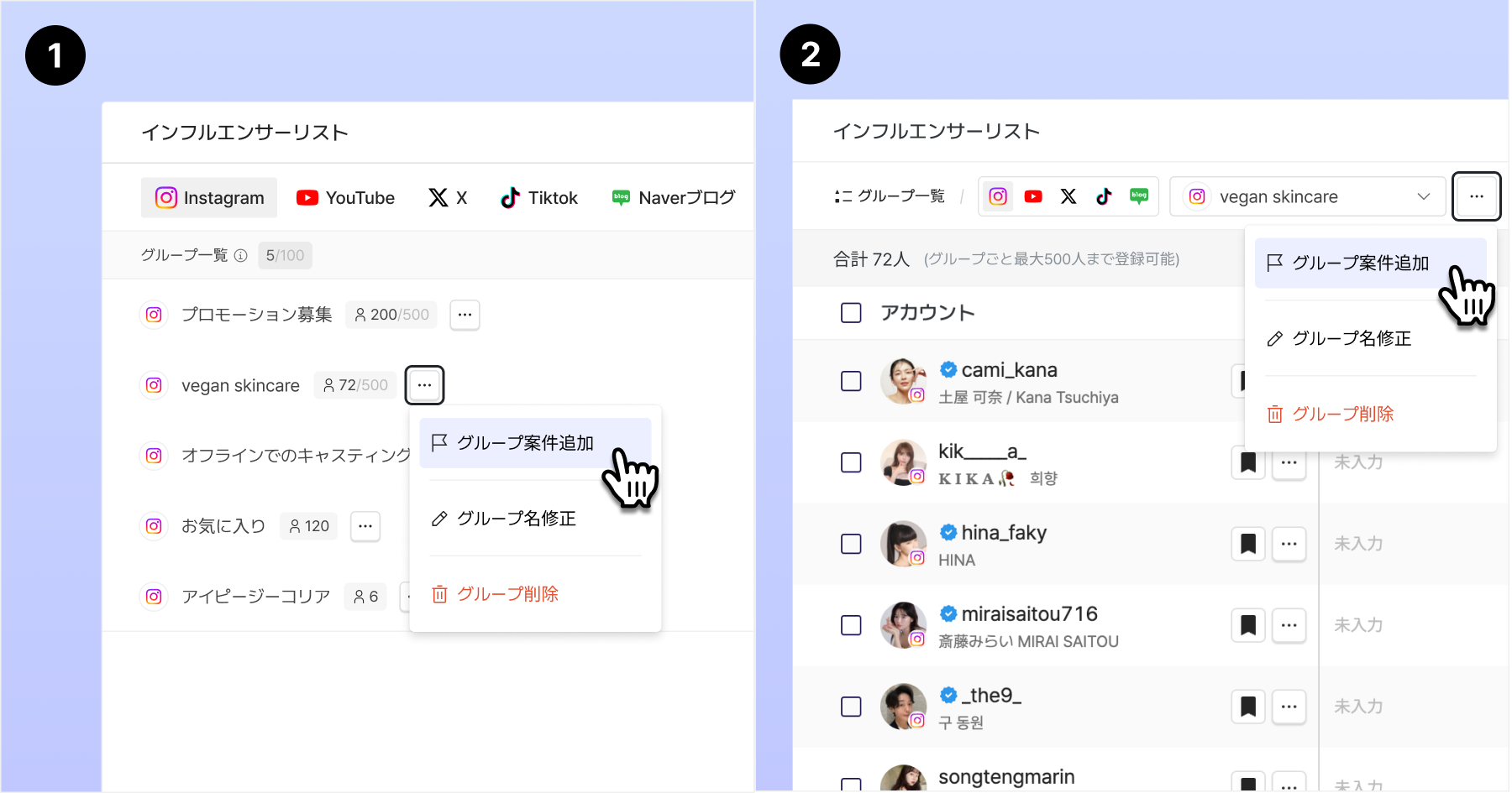 インフルエンサーグループに保存されたインフルエンサーをPR案件に追加できます。(個別/グループ追加可能)